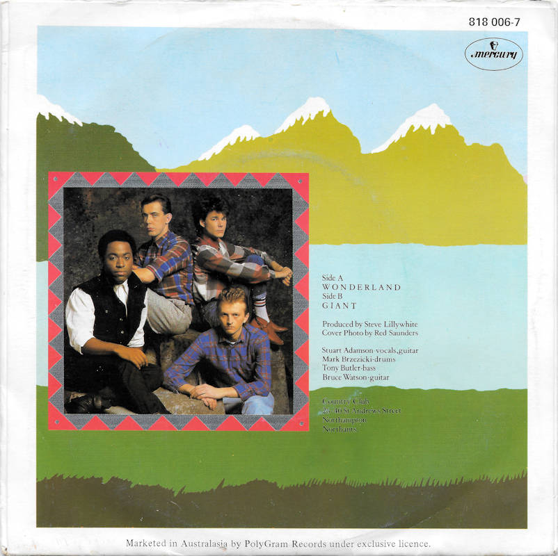 Wonderland (Australia), 818006-7 © 1984 Phonogram Ltd. / Mercury / CBS. Released 1984, top-opening matt card colour sleeve, colour paper record labels. Side 1: Wonderland (Big Country) Side 2: Giant (Big Country) Both tracks Produced by Steve Lillywhite. Cover photo by Red Saunders. Published by CBS. Stuart Adamson: Vocals, guitar. Mark Brzezicki: Drums. Tony Butler: Bass. Bruce Watson: Guitar. Made and Marketed by PolyGram Records under exclusive licence. |