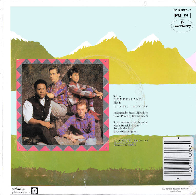 Wonderland (France), 818837-7 © 1984 Phonogram Ltd. / Mercury / Virgin Music Publishing Ltd. Released 1984, right-opening matt paper colour sleeve, blue injection-moulded cut-out record labels. Side 1: Wonderland (Big Country) (3:56) Side 2: In a Big Country (Big Country) (3:52) ℗ 1984 Phonogram (London) Ltd. Produced by Steve Lillywhite. Cover photo by Red Saunders. Stuart Adamson: Vocals, guitar. Mark Brzezicki: Drums. Tony Butler: Bass. Bruce Watson: Guitar. Rights Societies: SACEM SACD SDRM SGDL. Price Code: PG 101. Barcode: 042281883774. Pressed by Polygram Industries Messageries. Made and printed in France. Runouts: (1) "003 818837 7 // 1 380 POLYGRAM A2"; (2) "003 |