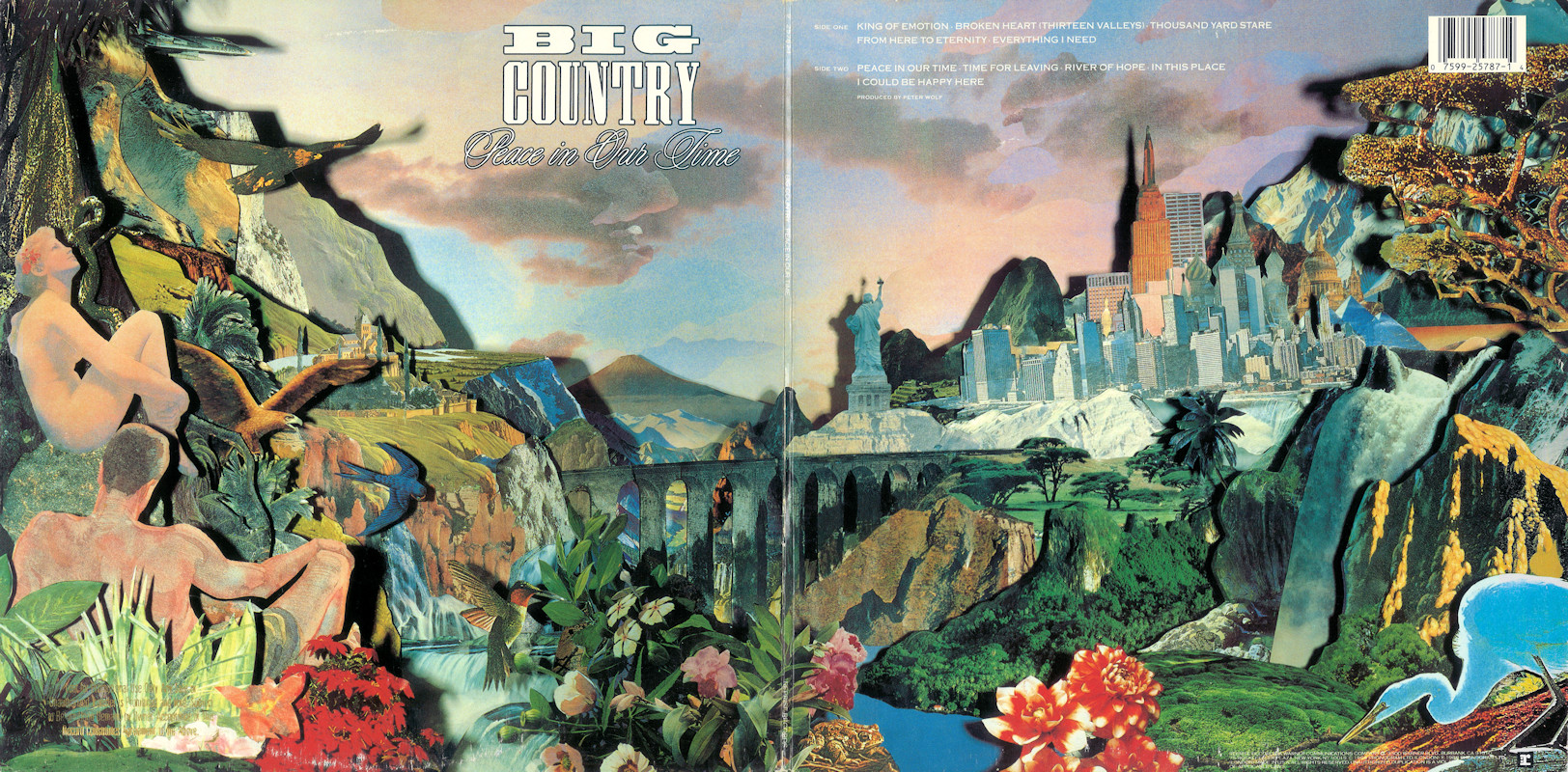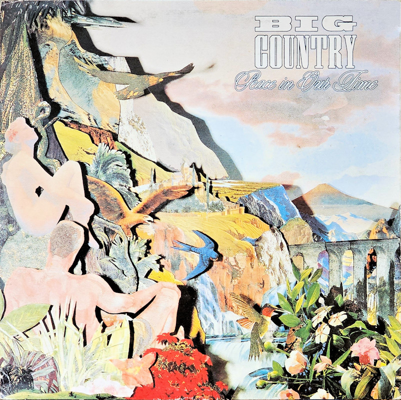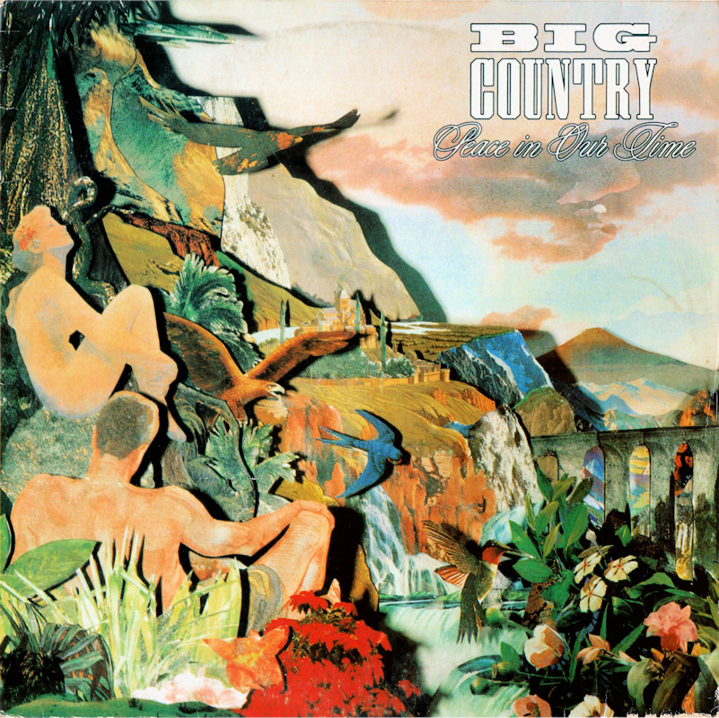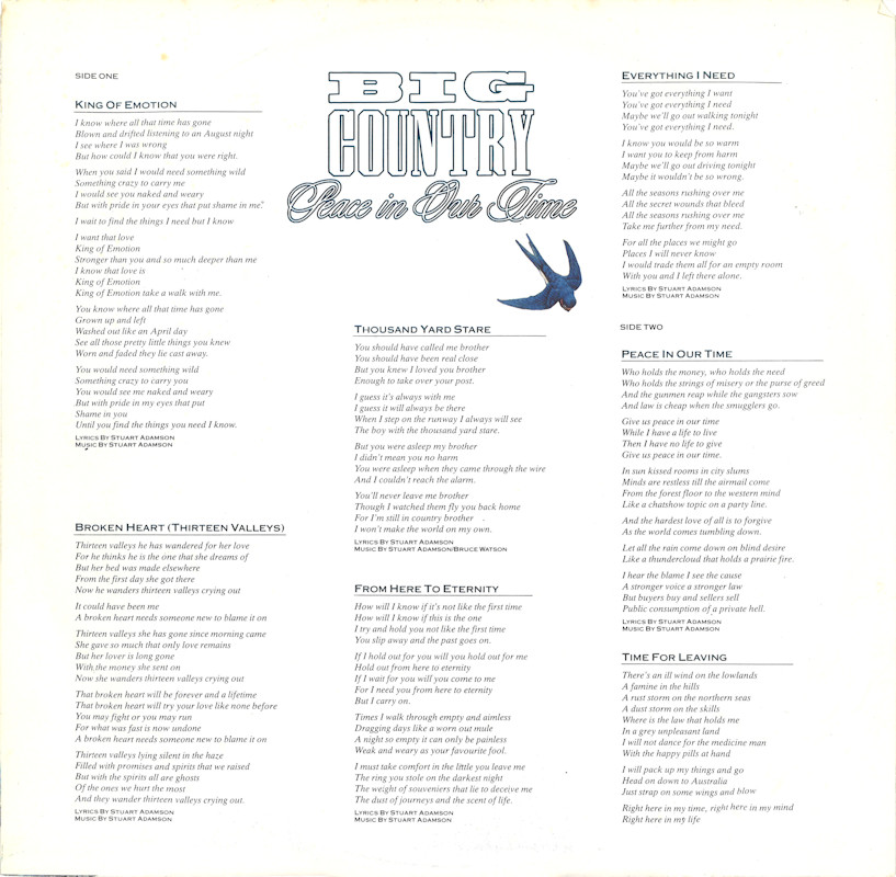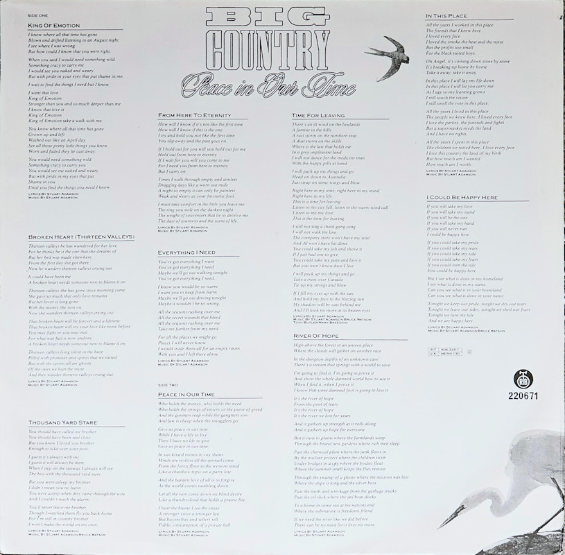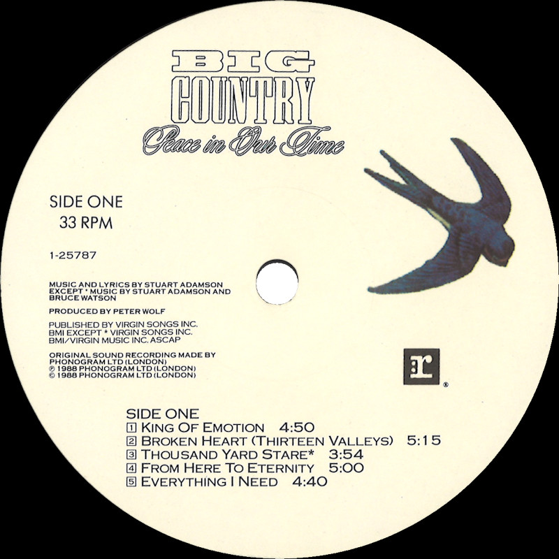Peace In Our Time (USA Gatefold, Promo), 25787-1 © 1988 Phonogram Ltd. (London) / Reprise / Virgin Songs Inc. Released September 1988 in card left-opening gatefold gloss card sleeve with white spine text and gold promo stamp, glossy lipped paper lyric inner sleeve, colour paper record labels. Side 1: 1 King Of Emotion (Stuart Adamson) (4:50), 2 Broken Heart (13 Valleys) (Stuart Adamson) (5:15), 3 Thousand Yard Stare (Stuart Adamson/Bruce Watson) (3:54), 4 From Here To Eternity (Stuart Adamson) (5:00), 5 Everything I Need (Stuart Adamson) (4:40). Side 2: 1 Peace In Our Time (Stuart Adamson) (4:33), 2 Time For Leaving (Stuart Adamson/Bruce Watson/Tony Butler/Mark Brzezicki) (5:05), 3 River of Hope (Stuart Adamson) (4:33), 4 In This Place (Stuart Adamson) (4:20), 5 I Could Be Happy Here (Stuart Adamson/Bruce Watson) (4:30). ℗ & © 1988 Phonogram Ltd.(London). Produced by Peter Wolf. Engineered by Brian Malouf & Jeremy Smith. Mixed by Brian Malouf. Pre-Production at Balmule Studios, Dunfermline. Recorded at 41B Studios, Westlake Village. Mixed at Smoketree Studios. All words and Music by Stuart Adamson, except 3 & 10 also by Bruce Watson and 7 also by Bruce Watson, Tony Butler & Mark Brzezicki. Stuart Adamson: Vocals, Guitars & E-Bow. Mark Brzezicki: Drums & Percussion. Tony Butler: Bass Vocals, Guitar. Bruce Watson: Guitars, Mandolin, Sitar, Mouth Organ & E-Bow. Keyboards by Peter Wolf. Additional vocals by Merry Clayton, Ina Wolf, Donna Davidson, Maxi Anderson. Live Keyboards by Josh Phillips Gorse. Rights Societies: BMI (except A3, B2 & B5 BMI/ASCAP). Published in USA & Canada by Virgin Songs Inc. (except A3, B2 & B5 Virgin Songs Inc./Virgin music Inc.) Barcode: 0 7599-25787-1 4. Made in U.S.A. Mastered at Precision Mastering & Sheffield Lab Matrix. Pressed by Allied record Company. Runouts: (1) "1-25787-A SH1 DMM Precision B32305-SH1-DMM Δ 21843 1-1", (2) "1-25787-B SH1 DMM Precision B32306-SH1-Dmm Δ 21843 X-1" (both etched). Spine text: "9 25787-1 BIG COUNTRY - PEACE IN OUR TIME REPRISE RECORDS". Promo stamp: "Lent for Promotional Use Only. Any Sale or Unauthorized transfer is Prohibited and Void Subject to Return Upon Demand by Owner. Acceptance of this Record Constitutes Agreement to the Above." Also available on: CD Longbox: 25787-2