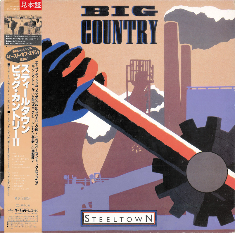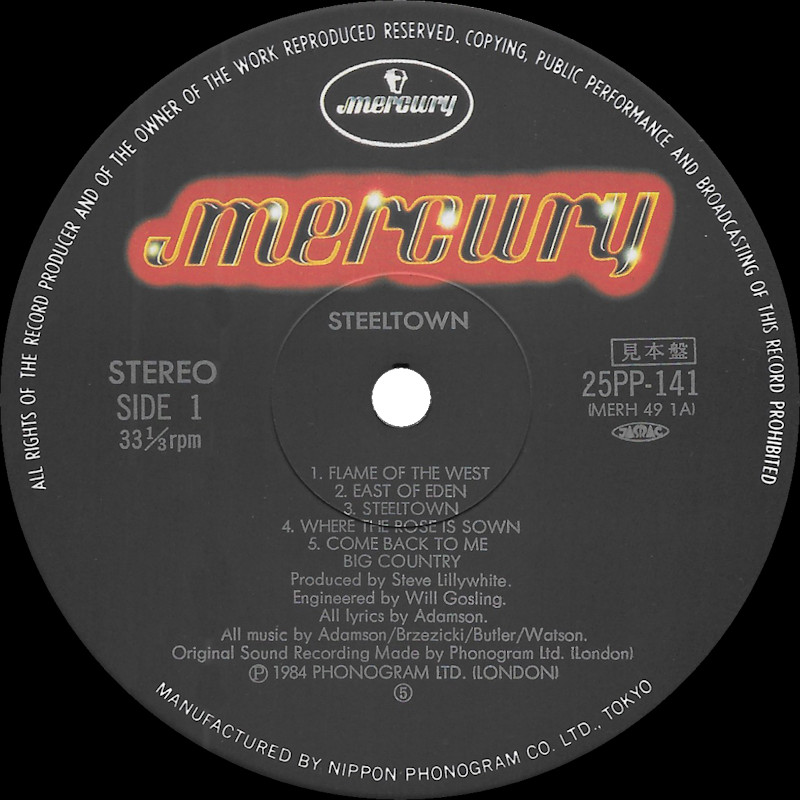 Steeltown (Japan, Promo), 25PP-141 (Signed by Bruce & Mark) © 1984 Phonogram Ltd. (London) / Mercury / 10 Music Ltd. Released 10th November 1984 in card box sleeve with black side print & paper OBI Strip, 4-panel folded paper lyric sheet (29x29cm), colour paper labels. Side One: 1 Flame Of The West, 2 East Of Eden, 3 Steeltown, 4 Where The Rose Is Sown, 5 Come Back To Me. Side Two: 1 Tall Ships Go, 2 Girl With Grey Eyes, 3 Rain Dance, 4 The Great Divide, 5 Just A Shadow. © & ℗ 1984 Phonogram Ltd., London Stuart Adamson: Vocals, Guitars, E-Bow; Mark Brzezicki: Drums & Percussion; Tony Butler: Vocals & Bass; Bruce Watson: Guitar, E-Bow & Mandolin; Producer: Steve Lillywhite, Engineer: Will Gosling. Recorded at: Polar Studios, Stockholm and RAK Studios, London. Mixed at: RAK Studios, London and Roundhouse Studios, London. All words by Stuart Adamson, All Music by Adamson, Brzezicki, Butler, Watson. Lyrics reproduced by kind permission of 10 Music Ltd. Sleeve Design: J.B. (Julian Balme), Photography: Brian Aris. Management: Grant·Edwards. Price Code: PG 224; Rights Society: JASRAC. Manufactured and distributed by Nippon Phonogram Co. Ltd., Tokyo. Made in Japan. Translucent (brown) vinyl. Runout text: (1) "MERH-491A 111 10 TW V JIS(circled) B(circled)", (2) "MERH-491B 111 5" (both stamped). Symbol in runouts denotes "Japanese Industrial Standards". Pressed on translucent black vinyl. Also available on Chromium Dioxide Cassette 25PT-231.
