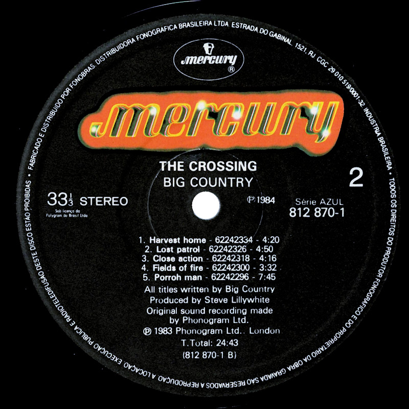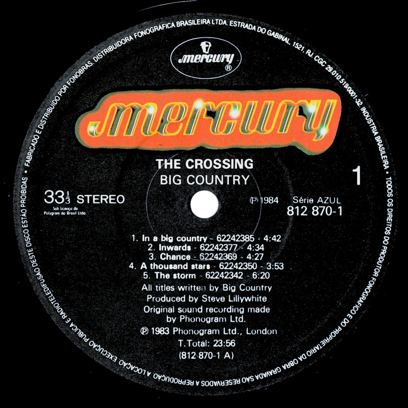 The Crossing (Greece), 812 870-1 © 1983 Phonogram Ltd. (London) / Mercury / Virgin Music (Publishers) Ltd. Released 1983 in blue smooth card box sleeve with black side print, "No1 in Britain" on the front (TL), greaseproof-paper inner, black paper record labels. Side One: 1 In A Big Country, 2 Inwards, 3 Chance, 4 1000 Stars, 5 The Storm. Side Two: 1 Harvest Home, 2 Lost Patrol, 3 Close Action, 4 Fields Of Fire, 5 Porrohman. ℗ & © 1983 Phonogram Ltd. (London) / Polygram. Bruce Watson: Guitars, E-Bow, Vocals; Stuart Adamson: Vocals, Guitars, E-Bow, Piano; Tony Butler: Bass Guitars, Vocals; Mark Brzezicki: Drums, Percussion, Vocals; Additional Vocals by Christine Beveridge. Produced by Steve Lillywhite, Engineered by Will Gosling, assisted by Steve Chase & Mike Nocito. Recorded at The Manor and RAK Studios, May 1983. Photo by Paul Cox. Sleeve by J.B. & Q.Branch (Julian Balme). Management: Ian Grant for Grant-Edwards Management. All tracks © Big Country/Virgin Music Ltd. Rights Society: AEPI. Manufactured by G.P.I. S.A 410. Lacquer Cut at G.P.I. S.A. Made in Greece. Runout text: (1) "MER 812870A MT410 1771" (stamped), (2) "MER 17(crossed out) 812870B MT410 1771" (stamped). Song lyrics on inner sleeve listed in album order.