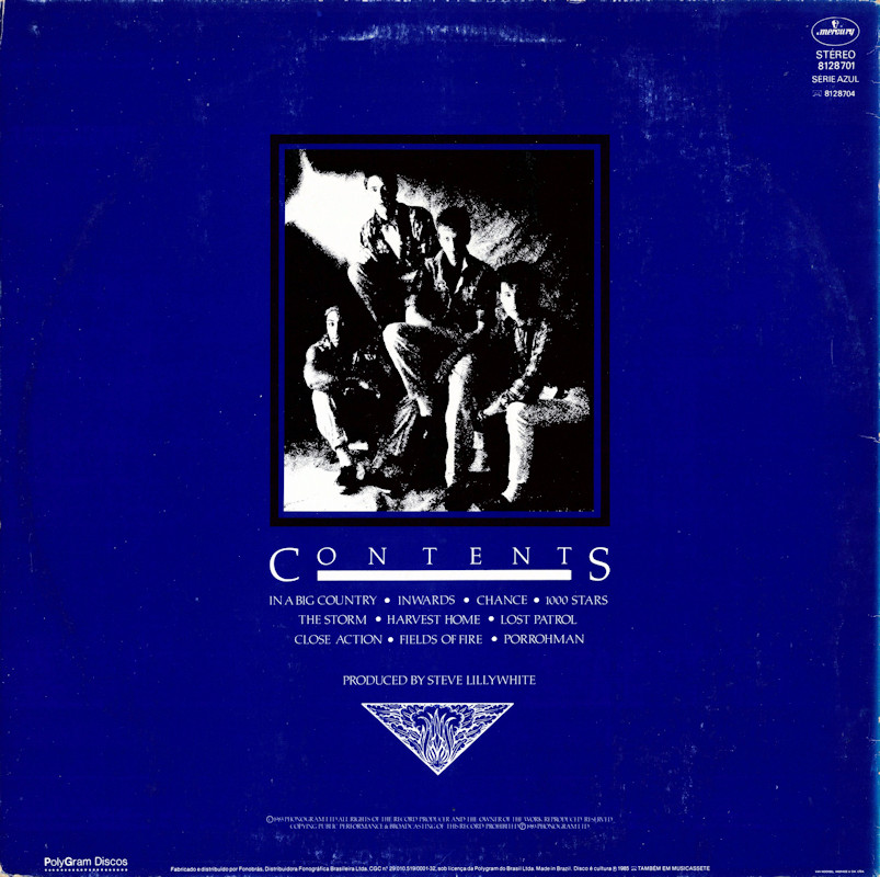 The Crossing (Brazil), 812870-1 © 1983 Phonogram Ltd. (London) / Mercury / Virgin Music (Publishers) Ltd. Released 1985 in blue smooth card sleeve with white lettering, black/colour paper record labels. Side One: 1 In A Big Country (4:42), 2 Inwards (4:34), 3 Chance (4:27), 4 1000 Stars (3:53), 5 The Storm (6:20). Side Two: 1 Harvest Home (4:20), 2 Lost Patrol (4:50), 3 Close Action (4:16), 4 Fields Of Fire (3:32), 5 Porrohman (7:45). ℗ & © 1983/4/5 Phonogram Ltd., London. Written by Big Country. Produced by Steve Lillywhite. Original sound recording made by Phonogram Ltd. Manufactured and distributed by Fonobras. Under license from Polygram do Brasil Ltda. Printed by Van Moorsel, Andrade & Cia. Ltda. Runout text: (1) "8128701 1 01 ℗1984 200" (etched), (2) "8128701 2 01 ℗1984 200" (etched). Bruce Watson: Guitars, E-Bow, Vocals; Stuart Adamson: Vocals, Guitars, E-Bow, Piano; Tony Butler: Bass Guitars, Vocals; Mark Brzezicki: Drums, Percussion, Vocals; Additional Vocals by Christine Beveridge. , Engineered by Will Gosling, assisted by Steve Chase & Mike Nocito. Recorded at The Manor and RAK Studios, May 1983. Photo by Paul Cox. Sleeve by J.B. & Q.Branch (Julian Balme). Management: Ian Grant for Grant-Edwards Management. All tracks © Big Country/Virgin Music Ltd. Also available on Cassette 8128704. |