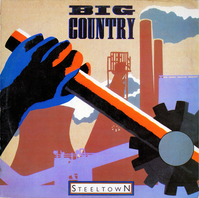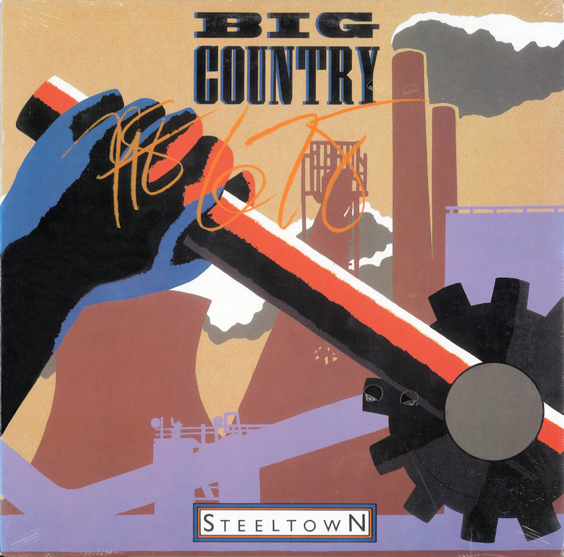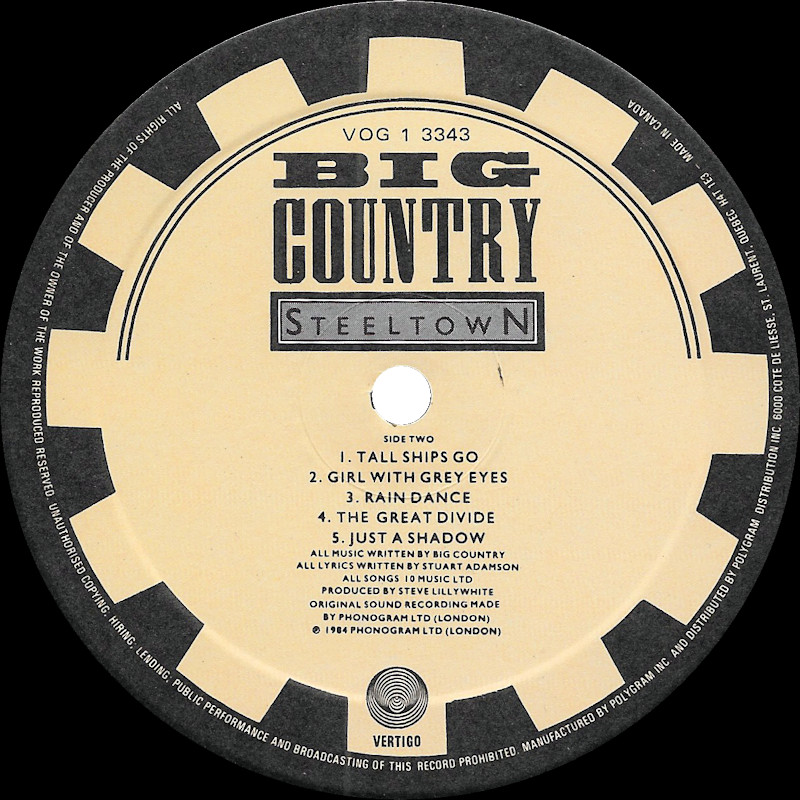 Steeltown (Canada), VOG 1 3343 (in original shrinkwrap) © 1984 Phonogram Ltd. (London) / Vertigo / 10 Music Ltd. Released 1984 in right-opening glossy card box sleeve with black edge print, double-sided top-opening black matt paper lipped lyric sheet, colour paper labels. Side One: 1 Flame Of The West (4:57), 2 East Of Eden (4:28), 3 Steeltown (4:36), 4 Where The Rose Is Sown (4:58), 5 Come Back To Me (4:36). Side Two: 1 Tall Ships Go (4:37), 2 Girl With Grey Eyes (4:45), 3 Rain Dance (4:18), 4 The Great Divide (4:50), 5 Just A Shadow (5:38). © & ℗ 1984 Phonogram Ltd. (London) Stuart Adamson: Vocals, Guitars, E-Bow. Mark Brzezicki: Drums & Percussion. Tony Butler: Vocals & Bass. Bruce Watson: Guitar, E-Bow & Mandolin. Producer: Steve Lillywhite, Engineer: Will Gosling. Recorded at: Polar Studios, Stockholm and RAK Studios, London. Mixed at: RAK Studios, London and Roundhouse Studios, London. All words by Stuart Adamson. All Music by Adamson, Brzezicki, Butler, Watson. Lyrics reproduced by kind permission of 10 Music Ltd. Sleeve Design: J.B. (Julian Balme), Photography: Brian Aris. Management: Grant·Edwards. Manufactured by PolyGram Inc. Distributed by PolyGram Distribution Inc., Quebec. Made in Canada. Printed by Ever Reddy. Pressed by Cinram. Lacquer cut at Disques SNB Ltée. Lacquer but by Émile Lépine. Spine text: "STEELTOWN BIG COUNTRY VERTIGO VOG 1 3343". Runout text: (1) "VOG-1-3343A SNB 230 EL" (etched), "CR [circled]" (stamped), (2) "VOG-1-3343 |