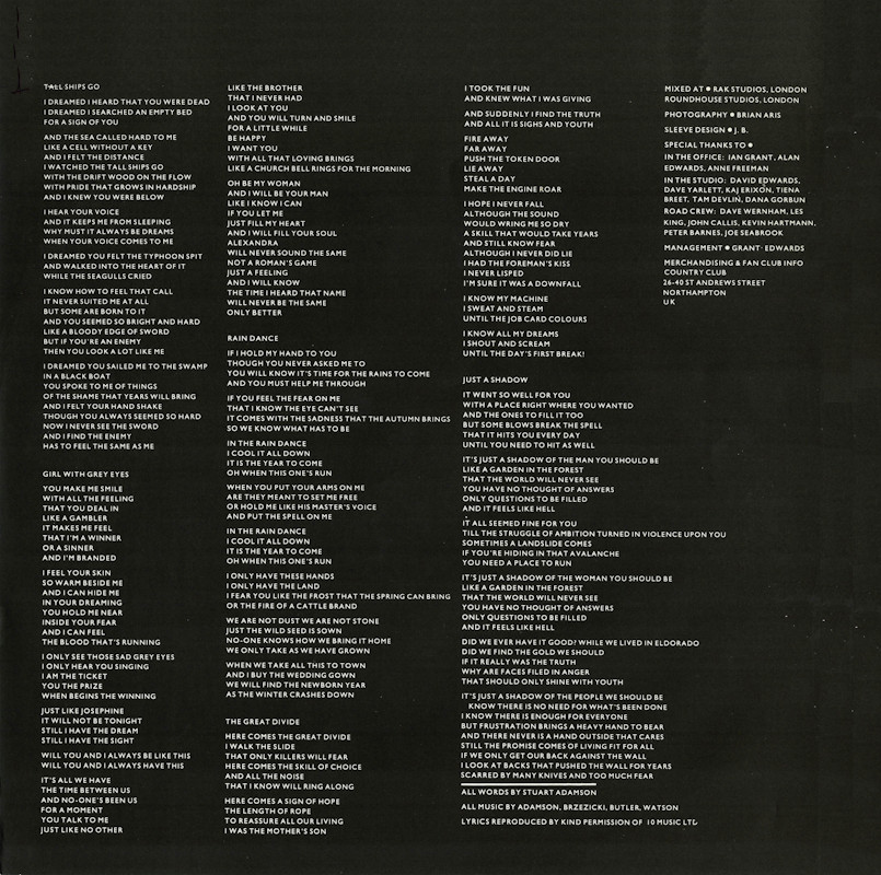 Steeltown (30th Anniversary Edition), 5348052 (signed by Bruce, Mark, Jamie, Simon & Derek) © 2014 Mercury Records Ltd. / UMC Universal Released 29th September 2014 in glossy gatefold box-sleeve with black spine text, orange hype-sticker, colour paper labels. Side One: 1 Flame Of The West, 2 East Of Eden, 3 Steeltown, 4 Where The Rose Is Sown, 5 Come Back To Me. Side Two: 1 Tall Ships Go, 2 Girl With Grey Eyes, 3 Rain Dance, 4 The Great Divide, 5 Just A Shadow. Side Three: 1 Wonderland (A-Side), 2 Giant (B-Side), 3 Prairie Rose (B-Side), 4 Belief In The Small Man (B-Side), 5 Bass Dance (B-Side), 6 Winter Sky (B-Side). Side Four: 1 East Of Eden (Rough Mix)*, 2 Tall Ships Go (Rough Mix)*, 3 Where The Rose Is Sown (Rough Mix)*, 4 Come Back To Me (Rough Mix)*, 5 Bass Concerto (Work In Progress)*. ℗ 1984 Phonogram Ltd. (London). © 2014 Mercury Records Ltd. Stuart Adamson: Vocals, Guitars, E-Bow; Mark Brzezicki: Drums & Percussion; Tony Butler: Vocals & Bass; Bruce Watson: Guitar, E-Bow & Mandolin; Producer: Steve Lillywhite, Engineer: Will Gosling. Recorded at: Polar Studios, Stockholm and RAK Studios, London. Mixed at: RAK Studios, London and Roundhouse Studios, London. All words by Stuart Adamson, All Music by Adamson, Brzezicki, Butler, Watson. Lyrics reproduced by kind permission of 10 Music Ltd. Sleeve Design: J.B. (Julian Balme), Photography: Brian Aris. Management: Grant·Edwards. * Previously unreleased.