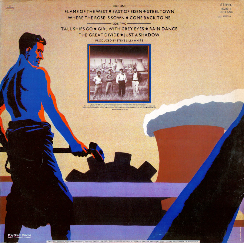 Steeltown (Portugal, Gatefold Sleeve), 822831-1 © 1984 Phonogram Ltd. (London) / Mercury / Virgin Music (Publishers) Ltd. Released 1984 in smooth card gatefold low-quality box sleeve with spine print, plastic record inner, purple/white paper labels. Side One: 1 Flame Of The West, 2 East Of Eden, 3 Steeltown, 4 Where The Rose Is Sown, 5 Come Back To Me. Side Two: 1 Tall Ships Go, 2 Girl With Grey Eyes, 3 Rain Dance, 4 The Great Divide, 5 Just A Shadow. © & ℗ 1984 Phonogram Ltd., London Stuart Adamson: Vocals, Guitars, E-Bow; Mark Brzezicki: Drums & Percussion; Tony Butler: Vocals & Bass; Bruce Watson: Guitar, E-Bow & Mandolin; Producer: Steve Lillywhite, Engineer: Will Gosling. Recorded at: Polar Studios, Stockholm and RAK Studios, London. Mixed at: RAK Studios, London and Roundhouse Studios, London. All words by Stuart Adamson, All Music by Adamson, Brzezicki, Butler, Watson. Sleeve Design: J.B. (Julian Balme), Photography: Brian Aris. Management: Grant·Edwards. Rights Society: SPA. Made in Portugal. Runout text: (1) "26/11/84 822831.1.Δ (signature)" (etched), (2) "26/11/84 822831.1.B (signature)" (etched). Also available on Cassette 822 831-4. |