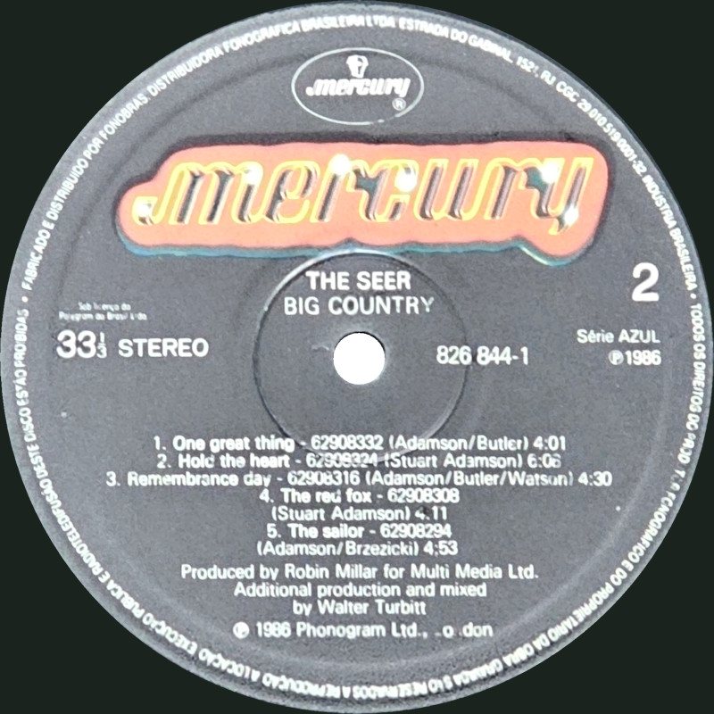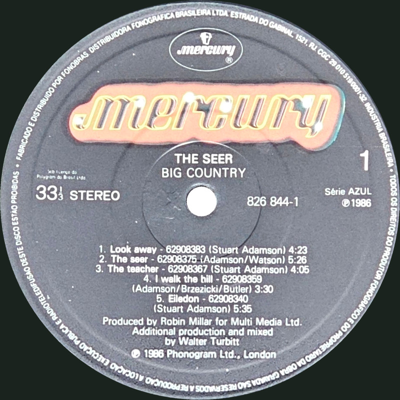 The Seer (Brazil), 826 844-1 © 1986 Phonogram Ltd. (London) / Mercury / 10 Music Ltd. Released: 1986 in right-opening narrow card box-sleeve with black spine print, matt paper b&w lyric insert, plastic inner, colour printed label. Side One: 1 Look Away (Stuart Adamson) (4:23), 2 The Seer (Adamson/Watson) (5:26), 3 The Teacher (Stuart Adamson) (4:05), 4 I Walk The Hill (Adamson/Brzezicki/Butler) (3:30), 5 Eiledon (Stuart Adamson) (5:35). Side Two: 1 One Great Thing (Adamson/Butler) (4:01), 2 Hold The Heart (Stuart Adamson) (6:08), 3 Remembrance Day (Adamson/Butler/Watson) (4:30), 4 The Red Fox (Stuart Adamson) (4:11), 5 The Sailor (Adamson/Brzezicki) (4:53). ℗ 1986 Série AZUL. ℗ 1986 Phonogram Ltd., London. Stuart Adamson: Vocals, Guitar, E-Bow; Mark Brzezicki: Drums, Percussion, Backing Vocals; Tony Butler: Bass, Bass Pedals, Backing Vocals; Bruce Watson: Guitar, Mandolin, Sitar; Original Production: Robin Millar, Mixed by: Walter Turbitt; Engineered by: Will Gosling; Assistant Engineers: Dave Anderson, Phil Legg, Nick Lacey, Russell Leahy. Additional vocals on 'The Seer' by Kate Bush. Backing vocals on 'Remembrance Day' & Eiledon by June Miles-Kingston. Bodhran: Davie Duncan. Sleeve by J.B. (Julian Balme); Illustrated by David Da Silva; Recorded at The Power Plant & RAK Studios, Mixed at Maison Rouge. Kate Bush Appears courtesy of EMI Records. Management: Grant·Edwards. Manufactured by Polygram Inc. Distributed by Polygram Distribution Inc. Made in Brazil. CGC no 29.101.519/0001-32 sob licenca da Polygram do Brasil Ltda. Record Company: Polygram do Brasil Ltda. Fabricado e distribuido por Fonobrás, Distribuidora Fonográfica Brasileira Ltda. Spine text:BIG COUNTRY · THE SEER · MERCURY 826844-1. Runout text: (1) "826 844 1 1 01 ℗ 1986 200", (2) "826 844 1 2 01 ℗ 1986 200" (both etched). Também em Musicassette 826 844-4. Lyric sheet states: "Este encarte pertence ao LP 826 844-1. Nao pode ser vendido separadamente" ("This insert belongs to LP 826 844-1. Cannot be sold separately"). Sleeve is a lower-quality copy of the original, over-printed with additional text on the rear. The track titles on the rear cover are listed in album order. |