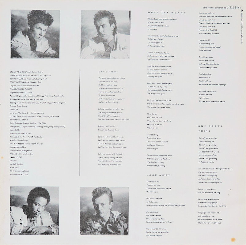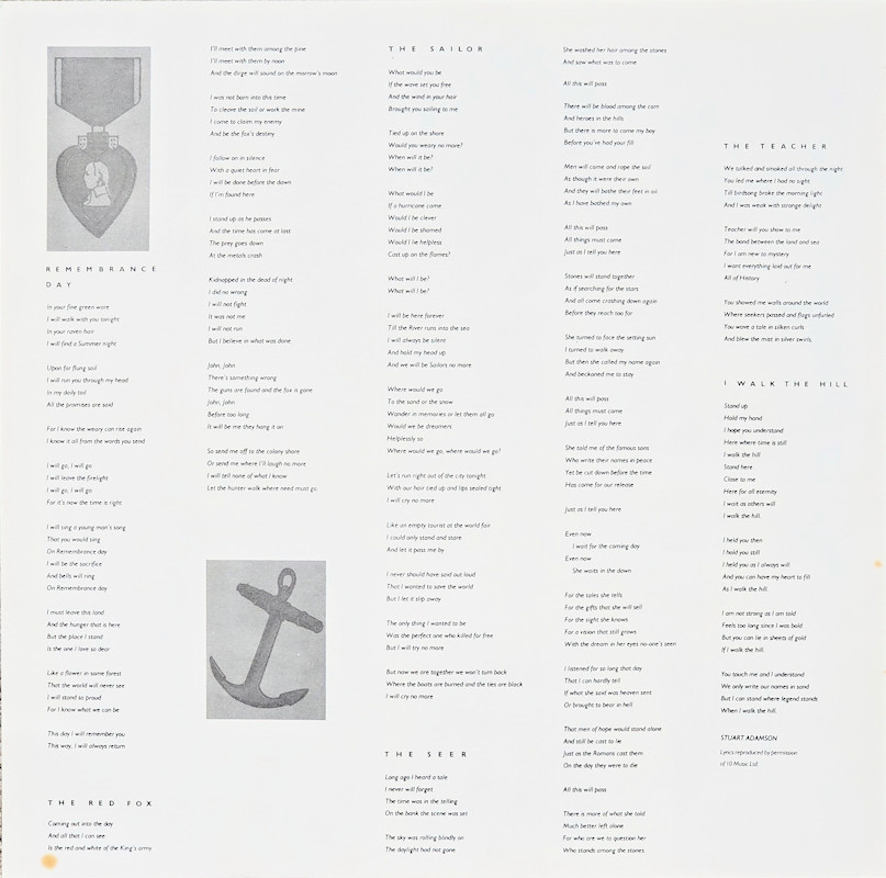 The Seer, MERH 87 © 1986 Phonogram Ltd. (London) / 10 Music Ltd. Released July 1986 in right-opening card box-sleeve, 2-sided paper lyric-sheet inner, yellow paper labels. Side One: 1 Look Away, 2 The Seer, 3 The Teacher, 4 I Walk The Hill, 5 Eiledon. Side Two: 1 One Great Thing, 2 Hold The Heart, 3 Remembrance Day, 4 The Red Fox, 5 The Sailor. © & ℗ 1986 Phonogram Ltd.(London). Stuart Adamson: Vocals, Guitar, E-Bow; Mark Brzezicki: Drums, Percussion, Backing Vocals; Tony Butler: Bass, Bass Pedals, Backing Vocals; Bruce Watson: Guitar, Mandolin, Sitar; Original Production: Robin Millar, Mixed by: Walter Turbitt; Engineered by: Will Gosling; Assistant Engineers: Dave Anderson, Phil Legg, Nick Lacey, Russell Leahy. Additional vocals on 'The Seer' by Kate Bush. Backing vocals on 'Remembrance Day' & Eiledon by June Miles-Kingston. Bodhran: Davie Duncan. Sleeve by J.B. (Julian Balme); Illustrated by David Da Silva; Recorded at The Power Plant & RAK Studios, Mixed at Maison Rouge. Kate Bush Appears courtesy of EMI Records. Management: Grant·Edwards. Also available on Cassette 826844-4 and Compact Disc. The track titles on the rear cover are listed in alphabetical order (omitting the "I" in "I Walk The Hill"). |