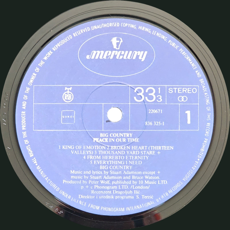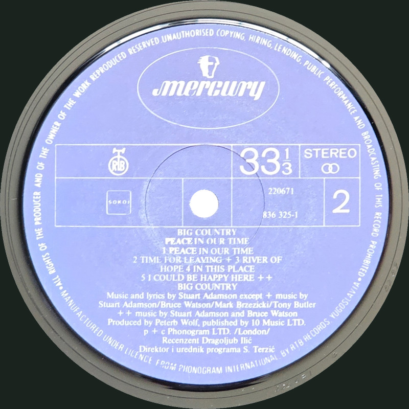Peace In Our Time (Yugoslavia), 220671 / 836325-1 © 1988 Phonogram Ltd. (London) / Mercury/PGP Records / 10 Music Ltd. Released 1989 in left-opening card box-sleeve with black spine text, double-sided b&w paper lyric inner sleeve, and colour paper record labels. Side 1: 1 King Of Emotion (Stuart Adamson) (4:50), 2 Broken Heart (13 Valleys) (Stuart Adamson) (5:15), 3 Thousand Yard Stare (Stuart Adamson/Bruce Watson) (3:54), 4 From Here To Eternity (Stuart Adamson) (5:00), 5 Everything I Need (Stuart Adamson) (4:40). Side 2: 1 Peace In Our Time (Stuart Adamson) (4:33), 2 Time For Leaving (Stuart Adamson/Bruce Watson/Tony Butler/Mark Brzezicki) (5:05), 3 River of Hope (Stuart Adamson) (4:33), 4 In This Place (Stuart Adamson) (4:20), 5 I Could Be Happy Here (Stuart Adamson/Bruce Watson) (4:30). ℗ & © 1988 Phonogram Ltd.(London). Produced by Peter Wolf. Engineered by Brian Malouf & Jeremy Smith. Mixed by Brian Malouf. Pre-Production at Balmule Studios, Dunfermline. Recorded at 41B Studios, Westlake Village. Mixed at Smoketree Studios. All words and Music by Stuart Adamson, except 3 & 10 also by Bruce Watson and 7 also by Bruce Watson, Tony Butler & Mark Brzezicki. Stuart Adamson: Vocals, Guitars & E-Bow. Mark Brzezicki: Drums & Percussion. Tony Butler: Bass Vocals, Guitar. Bruce Watson: Guitars, Mandolin, Sitar, Mouth Organ & E-Bow. Keyboards by Peter Wolf. Additional vocals by Merry Clayton, Ina Wolf, Donna Davidson, Maxi Anderson. Live Keyboards by Josh Phillips Gorse. Manufactured under license from Phonogram, Inc. by RTB Records, Yugoslavia. Made in Yugoslavia. Rights society: SOKOJ. Recenzent Dragoljub Ilic Direktor in urednik programa Stanko Terzic. (Programme Editor and Director: Stanko Terzic.) Barcode: 8 600278 220678. Runouts: (1) "220671 A 8289", (2) "220671 B 8289" (both etched). Spine text: "STEREO BIG COUNTRY - PEACE IN OUR TIME 220671". Sleeve cover is a low-quality cropped copy of the original, with a white box on the rear obscuring the original barcode etc. over-printed with additional text. Lyric sheet is a black and white cropped copy of the original colour inner record sleeve. |