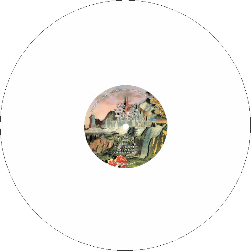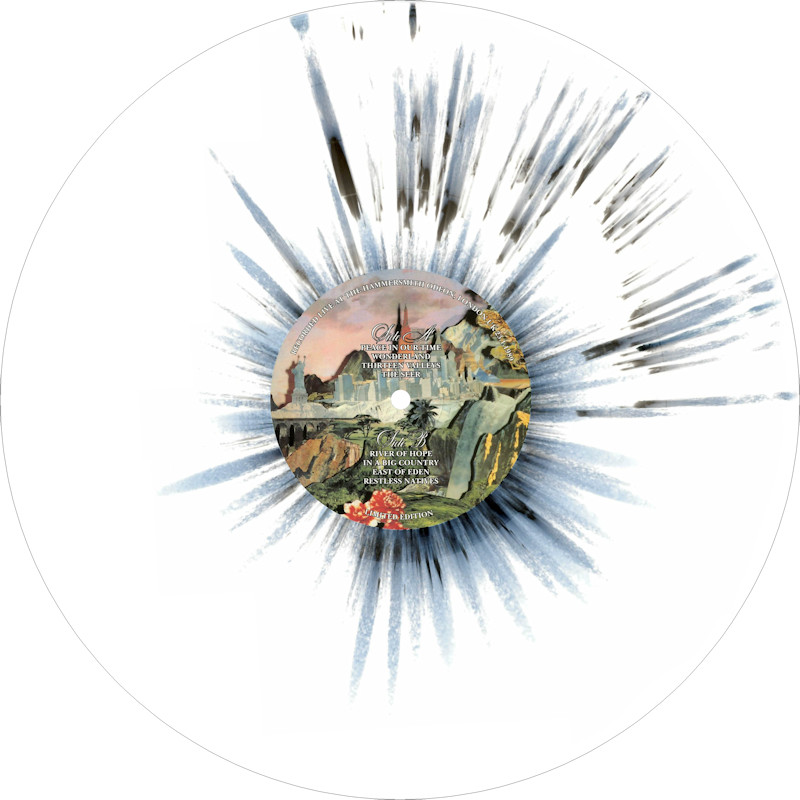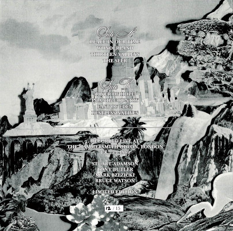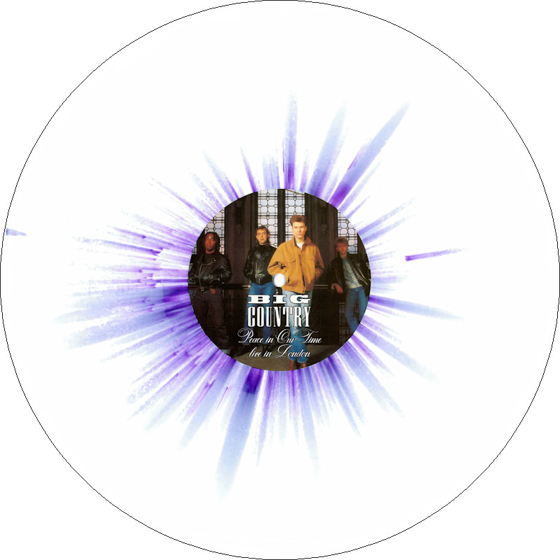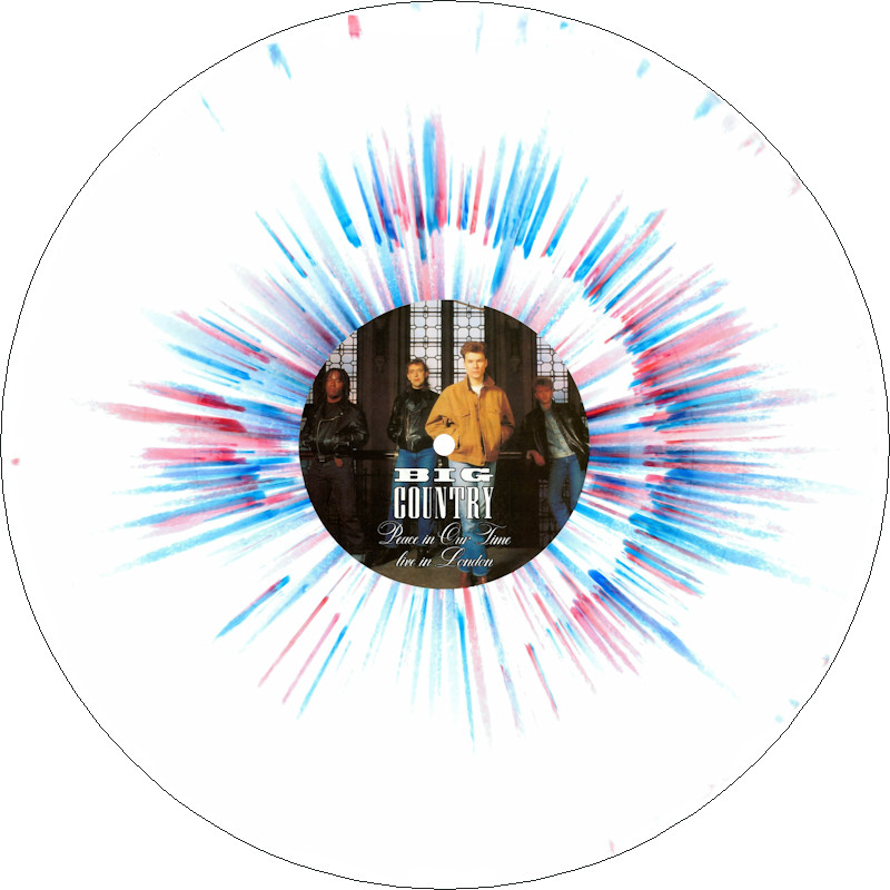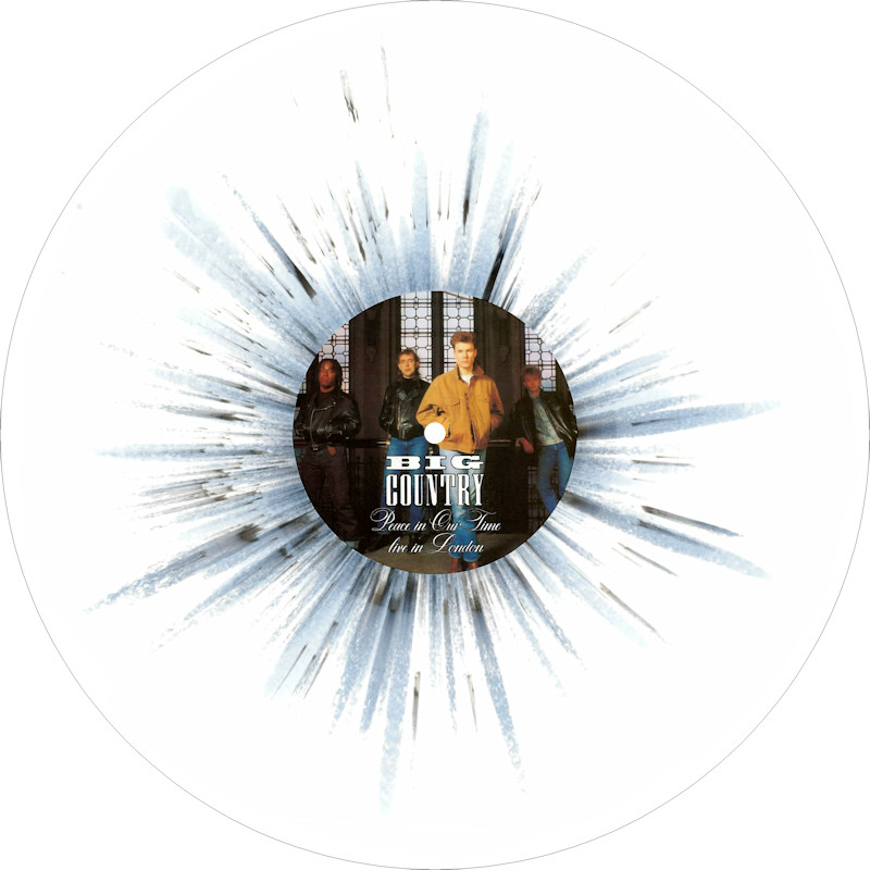 Peace In Our Time Live in London (Promo), BCL89 Released May 2025 in right-opening gloss card box sleeve w/spine print, round-ended plastic inner, 5x white/splatter vinyl w/colour paper labels. Side A: 1 Peace In Our Time, 2 Wonderland, 3 Thirteen Valleys, 4 The Seer. Side B: 1 River Of Hope, 2 In A Big Country, 3 East Of Eden, 4 Restless Natives. Limited Edition of 20 copies. Recorded at Hammersmith Odeon, London, 23rd January 1989. Big Country are: Stuart Adamson, Bruce Watson, Tony Butler, Mark Brzezicki. Spine text: "BIG COUNTRY PEACE IN OUR TIME BCL89". Runouts: (A,C,E,G,I) "18258 - 157067 A2 [infinity]", (B,D,F,H,J) "18258 - 157067 B [infinity]" (both etched).