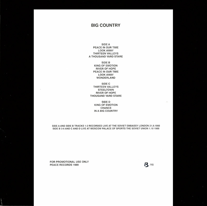 Peace Concerts 1988 (Promo) Released November 2025 in right-opening black card sleeve with A4 info sheet, round-ended plastic inners, 2x black vinyl with b&w paper record labels. Side A: 1 Peace In Our Time, 2 Look Away, 3 Thirteen Valleys, 4 Thousand Yard Stare. Side B: 1 King of Emotion, 2 River of Hope, 3 Peace In Our Time, 4 Look Away, 5 Wonderland. Side C: 1 Thirteen Valleys, 2 Steeltown, 3 River of Hope, 4 Thousand Yard Stare. Side D: 1 King of Emotion, 2 Chance, 3 In a Big Country. Limited Edition (No. 13 of 15). Side A and B (Tracks 1-2) recorded live at the Soviet Embassy, London, 21st September 1988. Side B (Tracks 3-6) and C & D recorded live at Moscow Palace of Sports, Soviet Union, 1st October 1988. For promotional use only. Peace Records 1989. Runouts: (A) "BCP88 A 1-1-", (B) "BCP88 B 1-1-", (C) "BCP88 D 1-1-", (D) "BCP88 C 1-1-" (all etched).