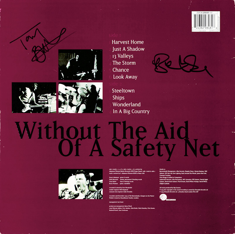 Without The Aid Of A Safety Net (Live), NOIS 5 / 7243 8 29848 1 8, (signed by Tony & Bruce) © 1994 Chrysalis Records Ltd. / Compulsion / EMI/10 Music Ltd. Released 6th June 1994 in glossy card box-sleeve with windowed paper inner, black/white paper record labels. Side One: 1 Harvest Home (3:27), 2 Just A Shadow (3:33), 3 13 Valleys (5:04), 4 The Storm (4:51), 5 Chance (3:43), 6 Look Away (4:20). Side Two: 1 Steeltown (5:41), 2 Ships (6:16), 3 Wonderland (5:51), 4 In A Big Country (6:22). ℗ & © 1994 Chrysalis Records Ltd. Produced by Big Country. Recorded on 29th December 1993 at Glasgow Barrowlands. Recorded and Mixed by Pete Woodroffe. Mobile Engineer: Will Shapland. Assistant Mix Engineer: Andy Kowalski. Managemant: Ian Grant. Manufactured and Distributed by EMI. Rights Society: BIEM/MCPS. Printed in UK. Runout text: (1) "NOIS 5 A-1-1- 1- D" (stamped) "TOWN HOUSE DMM" (etched), (2) NOIS 5 B-1-1-1- D" (stamped) "TOWN HOUSE DMM" (etched). Side A label has a typo in the ℗ info - attributed to "Chryslais Records Ltd." |