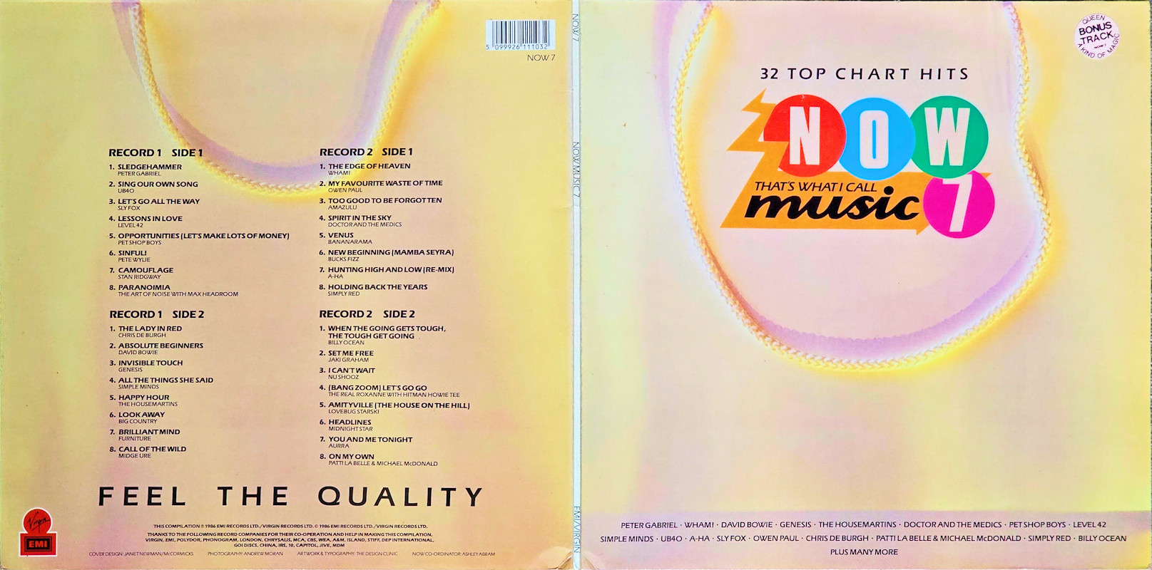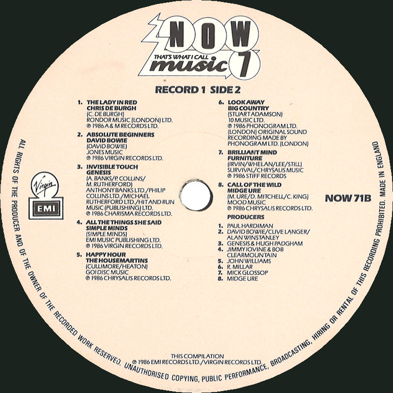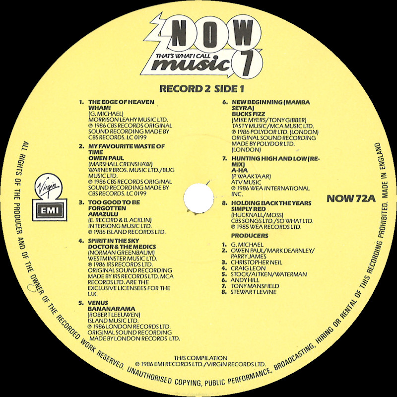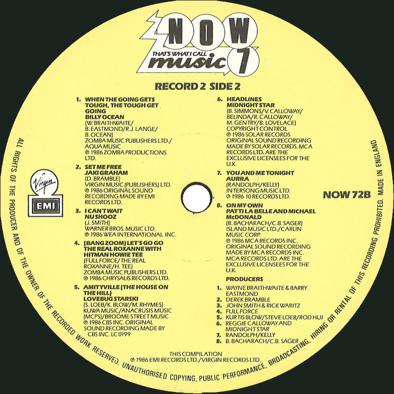 NOW That's What I Call Music 7 (Gatefold Sleeve), NOW 7 © 1986 EMI Records Ltd. / Virgin Records Ltd. / Polygram. Released 1986 in gloss card gatefold box sleeve with spine print and over-sticker, paper record inners, colour paper labels. Record One Side One: 1 Peter Gabriel Sledgehammer (4:53), 2 UB40 Sing Our Own Song (3:58), 3 Sly Fox Let's Go All The Way (3:56), 4 Level 42 Lessons In Love (3:59), 5 Pet Shop Boys Opportunities (Let's Make Lots Of Money) (3:20), 6 Pete Wylie Sinful! (3:54), 7 Stan Ridgway Camouflage (5:03), 8 The Art Of Noise With Max Headroom Paranoimia (3:15). Record One Side Two: 1 Chris De Burgh The Lady In Red (4:09), 2 David Bowie Absolute Beginners (5:33), 3 Genesis Invisible Touch (3:26), 4 Simple Minds All The Things She Said (4:15), 5 The Housemartins Happy Hour (2:19), 6 Big Country Look Away (4:23), 7 Furniture Brilliant Mind (3:39), 8 Midge Ure Call Of The Wild (4:17). Record Two Side One: 1 Wham! The Edge Of Heaven (4:28), 2 Owen Paul My Favorite Waste Of Time (3:25), 3 Amazulu Too Good To Be Forgotten (3:00), 4 Doctor & The Medics Spirit In The Sky (3:27), 5 Bananarama Venus (3:36), 6 Bucks Fizz New Beginning (Mamba Seyra) (4:05), 7 A-ha Hunting High And Low (Re-mix) (3:45), 8 Simply Red Holding Back The Years (4:10), 9 Queen A Kind Of Magic (4:24). Record Two Side Two: 1 Billy Ocean When The Going Gets Tough, The Tough Get Going (4:07), 2 Jaki Graham Set Me Free (3:36), 3 Nu Shooz I Can't Wait (3:37), 4 The Real Roxanne With Hitman Howie Tee (Bang Zoom) Let's Go Go (4:02), 5 Lovebug Starski Amityville (The House On The Hill) (4:09), 6 Midnight Star Headlines (3:21), 7 Aurra You And Me Tonight (3:56), 8 Patti LaBelle & Michael McDonald On My Own (4:33). This compilation ℗ & © 1986 EMI Records Ltd./Virgin Records Ltd. Cover Design: Janet Newman. Designed at McCormicks. Cover Artwork & Typography: The Design Clinic. Photography by Andrew Moran. Now Coordinator: Ashley Abram. Mastered by Nick Webb (Side D). Spine text: "NOW7 NOW MUSIC 7 EMI/VIRGIN". Runout text: (1) "NOW 71 A-1-1-1-1 D", (2) "NOW 71 B-1-1-3-3 D", (3) "NOW 71 A-3-1-2-X1 D", (4) "NOW 72 A-1-1-1-1 D" (all stamped) "NICKZ" (etched). Over-sticker track (Disc C9) not listed on sleeve or labels. Also available on 2x Cassette TCNOW7 and CD (CDNOW8) (2020). |