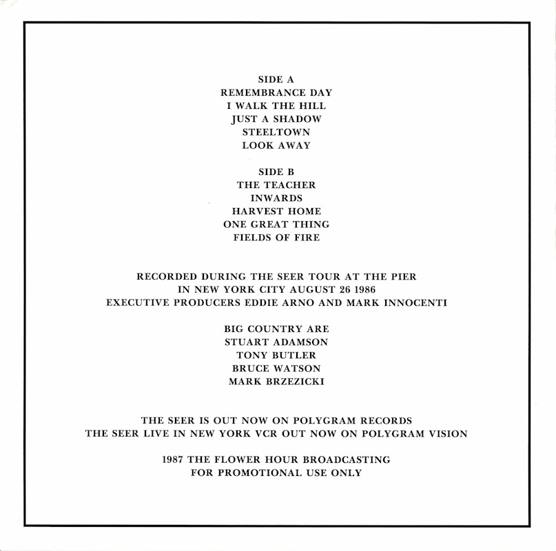 Live at The Pier New York City (Promo) Released 2024 in right-opening white card sleeve with spine print, round-ended plastic inner, clear yellow vinyl with b&w paper record labels. Side A: 1 Remembrance Day, 2 I Walk The Hill, 3 Just A Shadow, 4 Steeltown, 5 Look Away. Side B: 1 The Teacher, 2 Inwards, 3 Harvest Home, 4 One Great Thing, 5 Fields of Fire. Limited Edition. Recorded during the Seer Tour at The Pier in New York City, 26th August 1986. Executive Producers: Eddie Arno and Mark Innocenti. Big Country are: Stuart Adamson, Bruce Watson, Tony Butler, Mark Brzezicki. 1987 The Flower Hour Broadcasting. Show 128 for promotional use only. Spine text: "BIG COUNTRY THE SEER LIVE IN NEW YORK BCNY". Runouts: (A) "OC86 A [star]", (B) "OC86 B [star]" (both etched). |