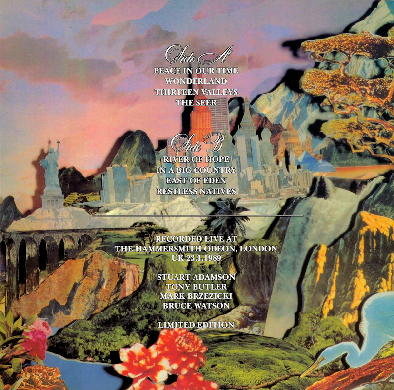 Peace In Our Time (Gatefold), MERH 130 (836325-1) © 1988 Phonogram Ltd. (London) / Mercury / 10 Music Ltd. Released September 1988 in left-opening card gatefold box-sleeve with hype sticker, white glossy paper lyric inner, white paper record labels. Side One: 1 King Of Emotion, 2 Broken Heart (13 Valleys), 3 Thousand Yard Stare, 4 From Here To Eternity, 5 Everything I Need. Side Two: 1 Peace In Our Time, 2 Time For Leaving, 3 River of Hope, 4 In This Place, 5 I Could Be Happy Here. ℗ & © 1988 Phonogram Ltd.(London). Produced by Peter Wolf. Engineered by Brian Malouf & Jeremy Smith. Mixed by Brian Malouf. Pre-Production at Balmule Studios, Dunfermline. Recorded at 41B Studios, Westlake Village. Mixed at Smoketree Studios. All words and Music by Stuart Adamson, except 3 & 10 also by Bruce Watson and 7 also by Bruce Watson, Tony Butler & Mark Brzezicki. Stuart Adamson: Vocals, Guitars & E-Bow. Mark Brzezicki: Drums & Percussion. Tony Butler: Bass Vocals, Guitar. Bruce Watson: Guitars, Mandolin, Sitar, Mouth Organ & E-Bow. Keyboards by Peter Wolf. Additional vocals by Merry Clayton, Ina Wolf, Donna Davidson, Maxi Anderson. Live Keyboards by Josh Phillips Gorse. Label Code: LC0268. Price Code: PG281.Made in England. Also available on: CD: 836 325-2 & MC: MERHC 130 (U.K.) / 836 325-4 (Int.).