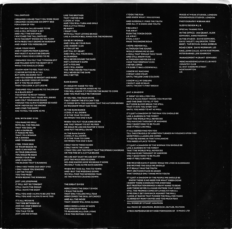 Steeltown, MERH 49 (822 831-1) © 1984 Phonogram Ltd. (London) / Mercury / 10 Music Ltd. Released 19th October 1984 in right-opening smooth matt card box sleeve with black edge print, double-sided top-opening black glossy paper lyric sheet, colour 'cog' paper label. Side One: 1 Flame Of The West, 2 East Of Eden, 3 Steeltown, 4 Where The Rose Is Sown, 5 Come Back To Me. Side Two: 1 Tall Ships Go, 2 Girl With Grey Eyes, 3 Rain Dance, 4 The Great Divide, 5 Just A Shadow. © & ℗ 1984 Phonogram Ltd. (London) Stuart Adamson: Vocals, Guitars, E-Bow; Mark Brzezicki: Drums & Percussion; Tony Butler: Vocals & Bass; Bruce Watson: Guitar, E-Bow & Mandolin; Producer: Steve Lillywhite, Engineer: Will Gosling. Recorded at: Polar Studios, Stockholm and RAK Studios, London. Mixed at: RAK Studios, London and Roundhouse Studios, London. All words by Stuart Adamson, All Music by Adamson, Brzezicki, Butler, Watson. Lyrics reproduced by kind permission of 10 Music Ltd. Sleeve Design: J.B. (Julian Balme), Photography: Brian Aris. Management: Grant·Edwards. Runout text: (1) "MERH 49 A // 1 Δ 420 H 1 12 11" (stamped), "TOWNHOUSE" (etched); (2) "MERH 49 B // 2 Δ 420 H 1 2 2" (stamped), "TOWNHOUSE" (etched). Also available on Chromium Dioxide Cassette MERHC49 and Compact Disc 822831-2. |