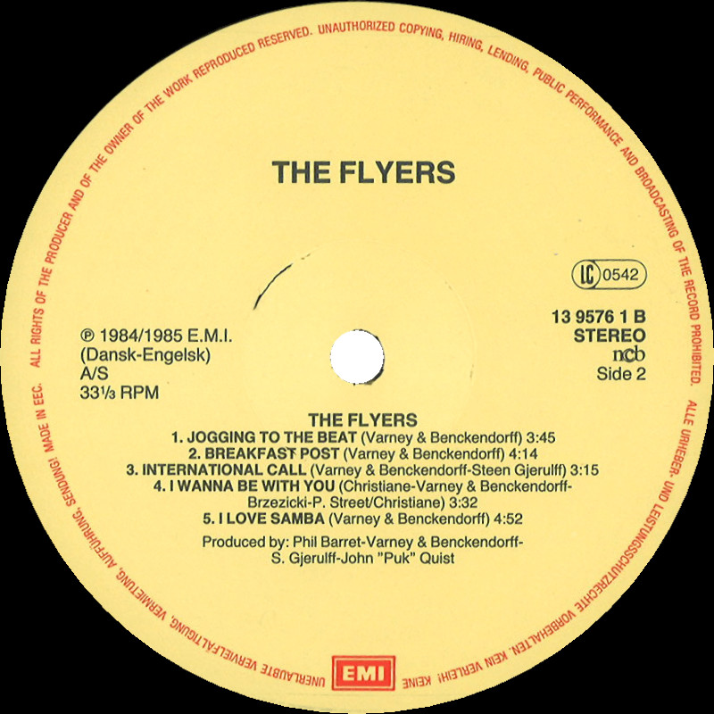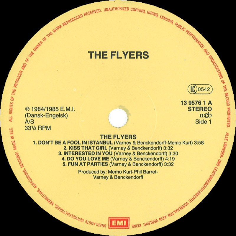 The Flyers - "The Flyers", LP, 13 9576 1 © 1984/5 EMI / Iceberg Publishing (DK). Released 1985 in right-opening card sleeve, colour paper record labels. Side 1: 1 Don't Be A Fool In Istanbul (Varney & Benckendorff, Memo Kurt) (3:58) 2 Kiss That Girl (Varney & Benckendorff) (3:32) 3 Interested In You (Varney & Benckendorff) (3:30) 4 Do You Love Me (Varney & Benckendorff) (4:19) 5 Fun At Parties (Varney & Benckendorff) (3:32) Side 2: 1 Jogging To The Beat (Varney & Benckendorff) (3:45) 2 Breakfast Post (Varney & Benckendorff) (4:14) 3 International Call (Varney & Benckendorff, Steen Gjerulff) (3:15) 4 I Wanna Be With You (Christiane, Varney & Benckendorff, Brzezicki, P. Street, Christiane) (3:32) 5 I Love Samba (Varney & Benckendorff) (4:52) © & ℗ 1984 EMI. A Produced by Memo Kurt, Phil Barret, Varney & Benckendorff. B Produced by Phil Barret, Varney & Benckendorff, S. Gjerulff, John "Puk" Quist. Programmed by Phil Barret: C.M.I., Fairlight and Synclavier. Recorded and digitally mixed at PUK Studios (DK) except International Call at Cue Mix Production (DK) and Don't Be A Fool In Istanbul at Brunwey Studio (Hamburg). Label Code: LC 0542. Rights Society: n©b. Lacquer cut at Bovema / EMI Studios Runouts: (A) "1 39576 1-A//58235-1", (B) "1 39576 1-B//58236-1" (both stamped). |