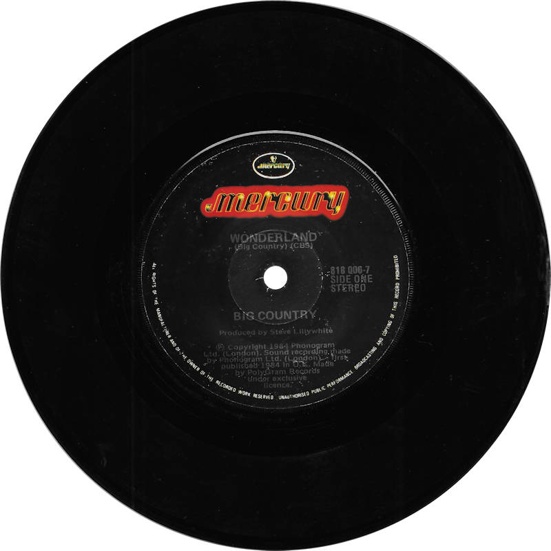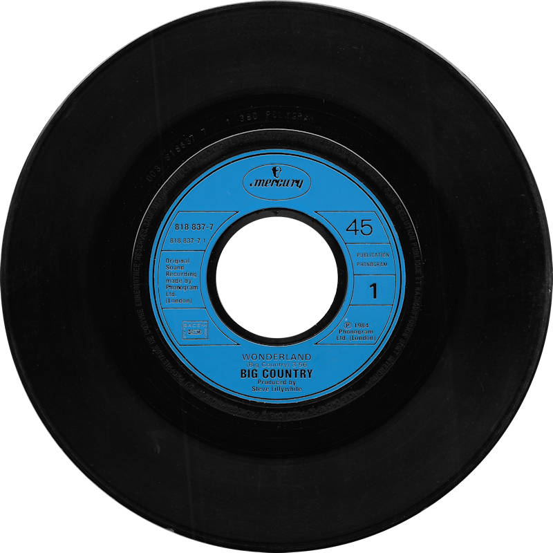Wonderland (Jukebox), COUNT 5 © 1984 Phonogram Ltd. / Mercury / Virgin Music (Publishers) Ltd. Released 1984, generic sleeve, silver injection-moulded cut-out labels. Side A: Wonderland (Big Country) Side B: Giant (Big Country) ℗ 1984 Phonogram (London) Ltd. Produced by Steve Lillywhite. Cover photo by Red Saunders. Stuart Adamson: Vocals, guitar. Mark Brzezicki: Drums. Tony Butler: Bass. Bruce Watson: Guitar. Runouts: (A): "COUNT 5 A//2Δ(inverted) 420 H 1 1 1 4", (B): "COUNT 5 B//4Δ(inverted) 420 H 1 1 1 0". |