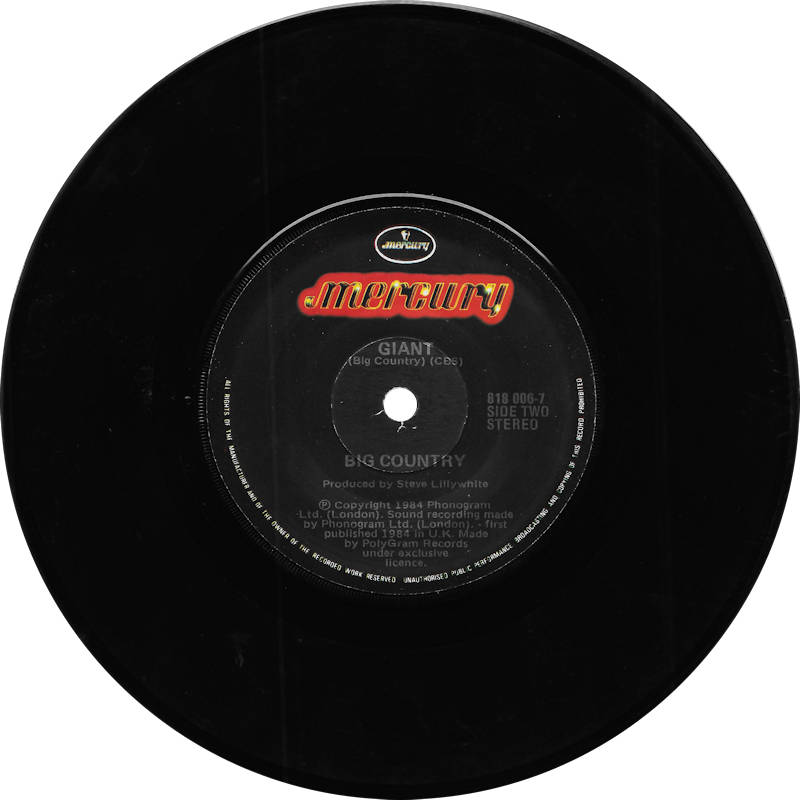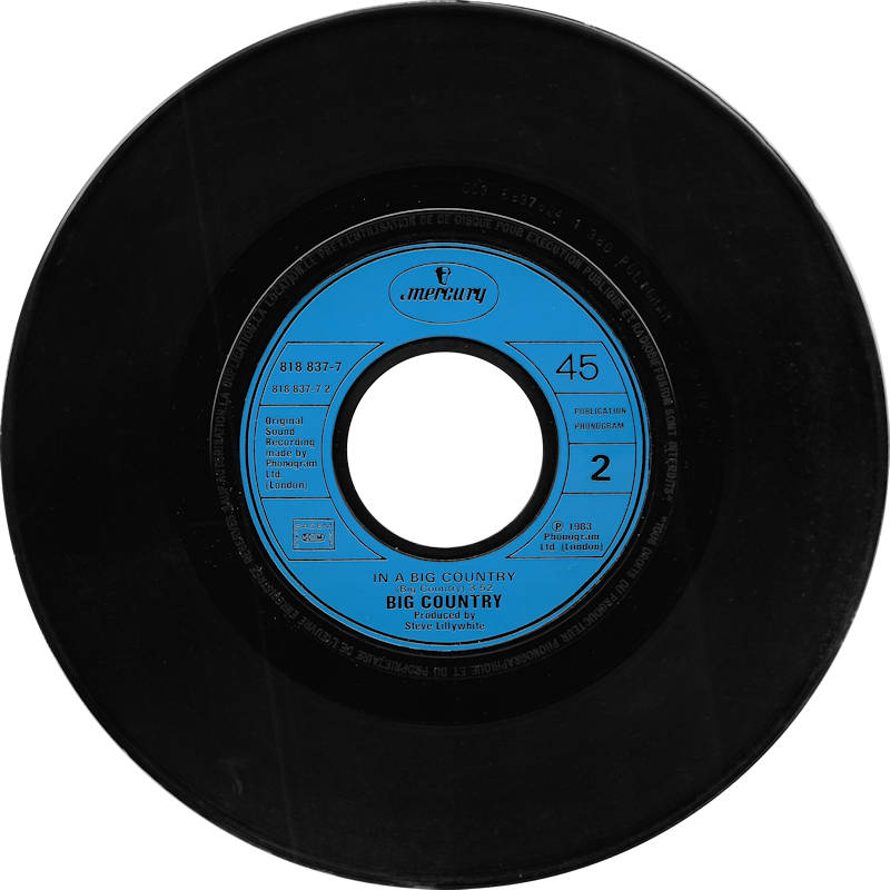 In A Big Country, COUNT 3 (812467-7) © 1983 Phonogram Records (London) / Mercury / Virgin Music Publishing Ltd. Released 1983, top-opening generic white paper sleeve, blue injection-moulded cut-out record labels. Side 1: In A Big Country (Big Country) Side 2: All Of Us (Big Country) ℗ 1983 Phonogram Records (London). Side 1 Produced by Steve Lillywhite; Side 2 Produced by Steve Lillywhite/Will Gosling/Big Country. Published by Virgin Music Publishing Ltd. N.B. This record generously donated by Den Hayward! |