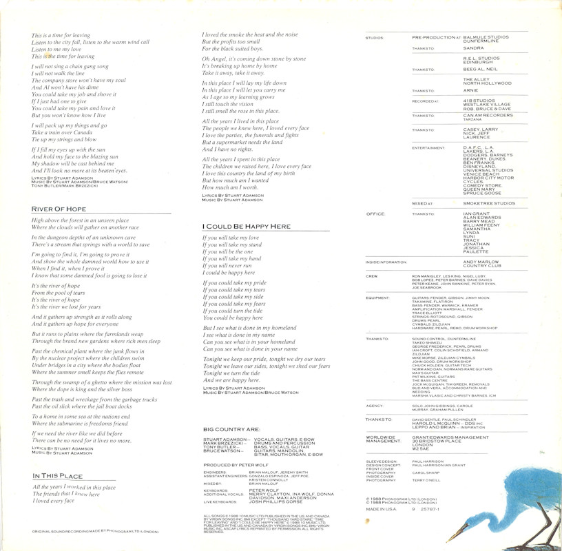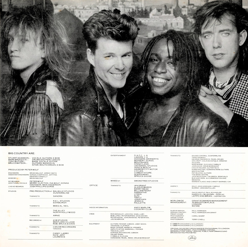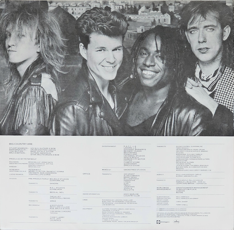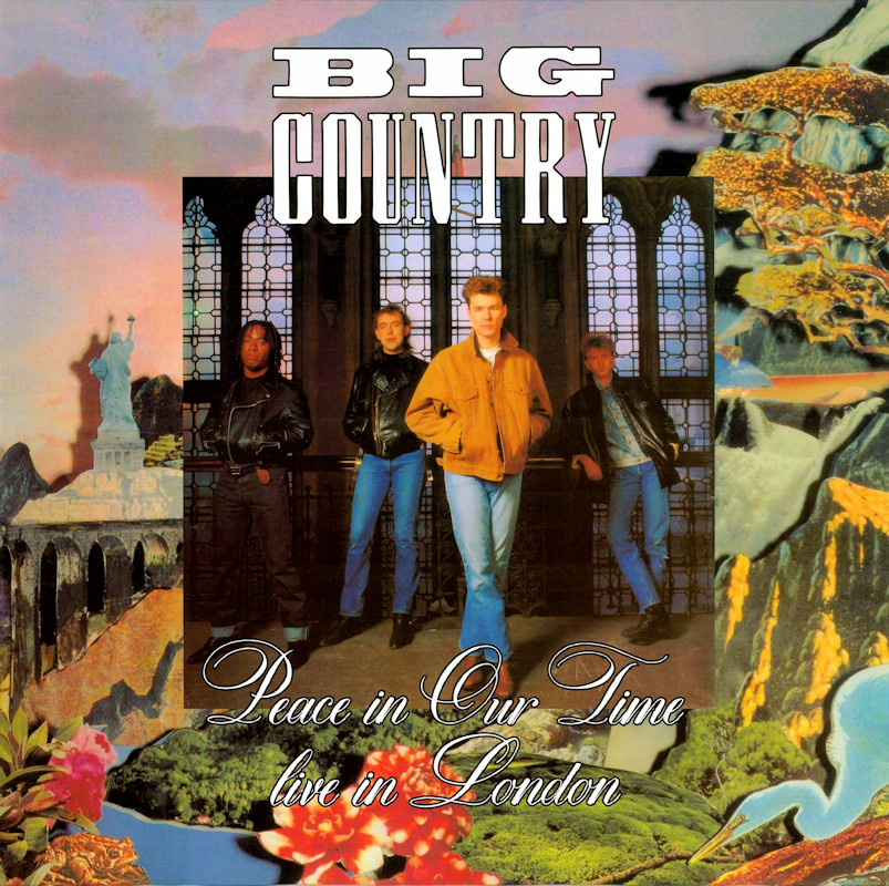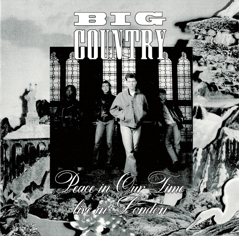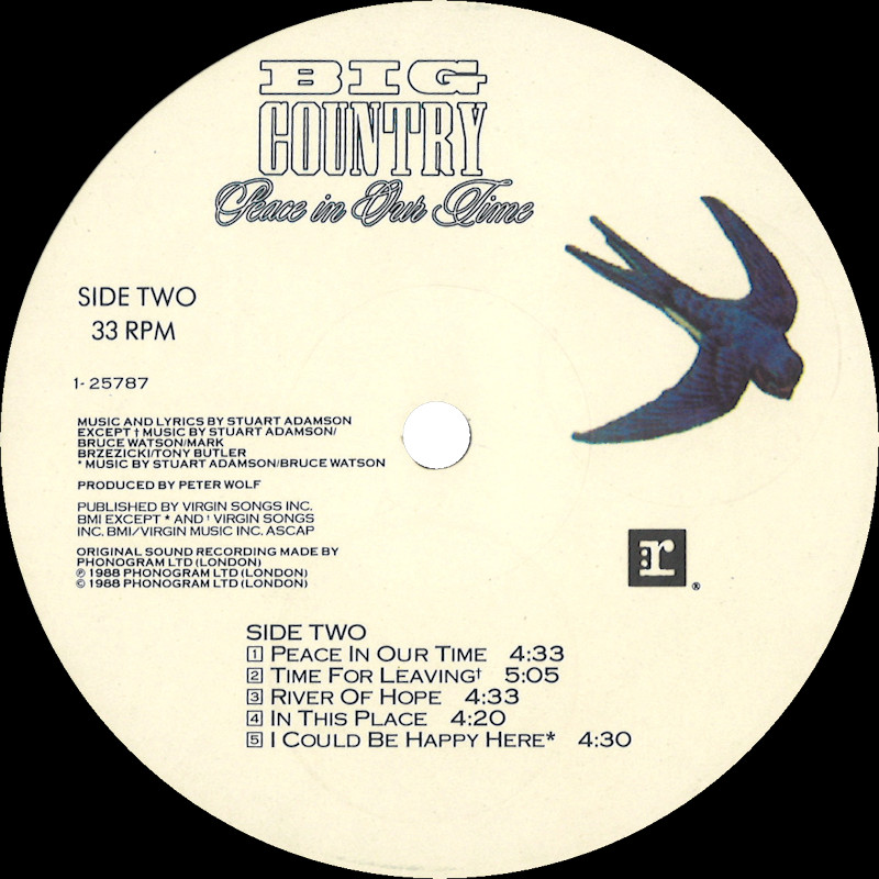 Peace In Our Time (USA Gatefold, Promo), 25787-1 © 1988 Phonogram Ltd. (London) / Reprise / Virgin Songs Inc. Released September 1988 in card left-opening gatefold gloss card sleeve with white spine text and gold promo stamp, glossy lipped paper lyric inner sleeve, colour paper record labels. Side 1: 1 King Of Emotion (Stuart Adamson) (4:50), 2 Broken Heart (13 Valleys) (Stuart Adamson) (5:15), 3 Thousand Yard Stare (Stuart Adamson/Bruce Watson) (3:54), 4 From Here To Eternity (Stuart Adamson) (5:00), 5 Everything I Need (Stuart Adamson) (4:40). Side 2: 1 Peace In Our Time (Stuart Adamson) (4:33), 2 Time For Leaving (Stuart Adamson/Bruce Watson/Tony Butler/Mark Brzezicki) (5:05), 3 River of Hope (Stuart Adamson) (4:33), 4 In This Place (Stuart Adamson) (4:20), 5 I Could Be Happy Here (Stuart Adamson/Bruce Watson) (4:30). ℗ & © 1988 Phonogram Ltd.(London). Produced by Peter Wolf. Engineered by Brian Malouf & Jeremy Smith. Mixed by Brian Malouf. Pre-Production at Balmule Studios, Dunfermline. Recorded at 41B Studios, Westlake Village. Mixed at Smoketree Studios. All words and Music by Stuart Adamson, except 3 & 10 also by Bruce Watson and 7 also by Bruce Watson, Tony Butler & Mark Brzezicki. Stuart Adamson: Vocals, Guitars & E-Bow. Mark Brzezicki: Drums & Percussion. Tony Butler: Bass Vocals, Guitar. Bruce Watson: Guitars, Mandolin, Sitar, Mouth Organ & E-Bow. Keyboards by Peter Wolf. Additional vocals by Merry Clayton, Ina Wolf, Donna Davidson, Maxi Anderson. Live Keyboards by Josh Phillips Gorse. Rights Societies: BMI (except A3, B2 & B5 BMI/ASCAP). Published in USA & Canada by Virgin Songs Inc. (except A3, B2 & B5 Virgin Songs Inc./Virgin music Inc.) Barcode: 0 7599-25787-1 4. Made in U.S.A. Mastered at Precision Mastering & Sheffield Lab Matrix. Pressed by Allied record Company. Runouts: (1) "1-25787-A SH1 DMM Precision B32305-SH1-DMM Δ 21843 1-1", (2) "1-25787-B SH1 DMM Precision B32306-SH1-Dmm Δ 21843 X-1" (both etched). Spine text: "9 25787-1 BIG COUNTRY - PEACE IN OUR TIME REPRISE RECORDS". Promo stamp: "Lent for Promotional Use Only. Any Sale or Unauthorized transfer is Prohibited and Void Subject to Return Upon Demand by Owner. Acceptance of this Record Constitutes Agreement to the Above." Also available on: CD Longbox: 25787-2