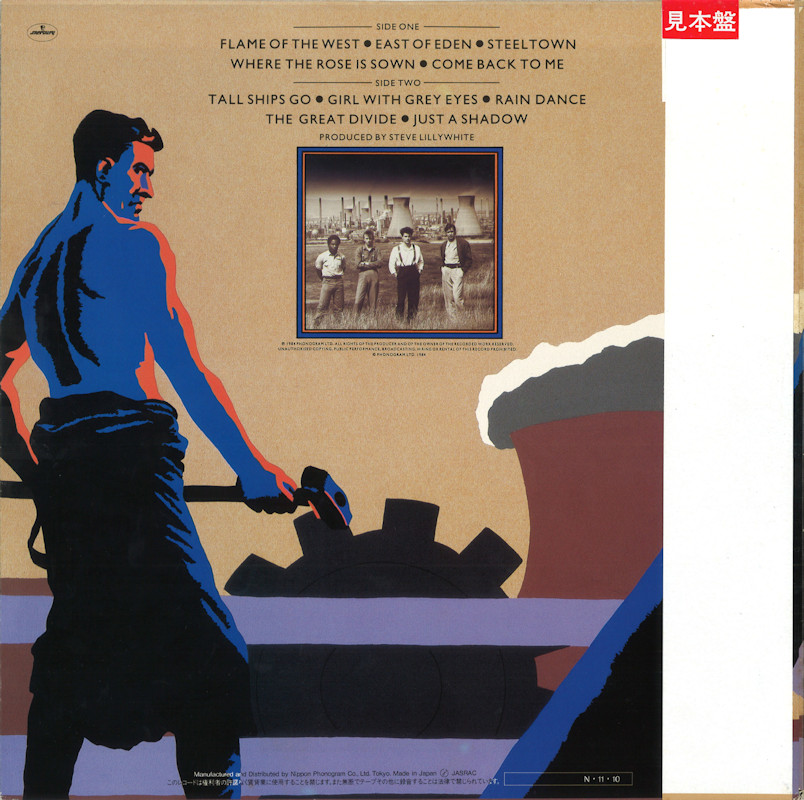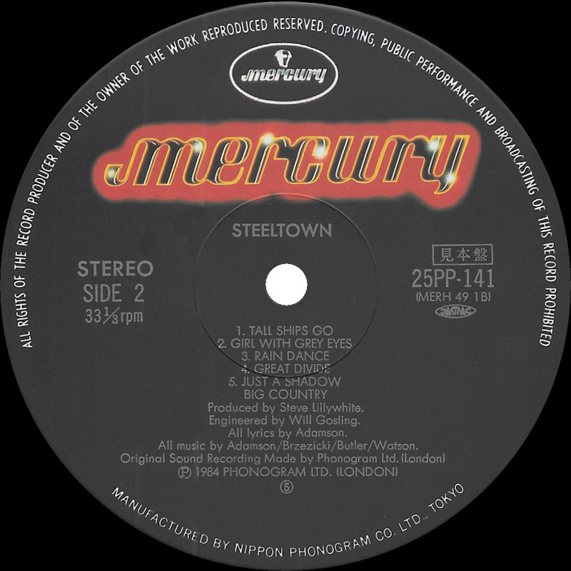 Steeltown (Japan, Promo), 25PP-141 (Signed by Bruce & Mark) © 1984 Phonogram Ltd. (London) / Mercury / 10 Music Ltd. Released 10th November 1984 in card box sleeve with black side print & paper OBI Strip, 4-panel folded paper lyric sheet (29x29cm), colour paper labels. Side One: 1 Flame Of The West, 2 East Of Eden, 3 Steeltown, 4 Where The Rose Is Sown, 5 Come Back To Me. Side Two: 1 Tall Ships Go, 2 Girl With Grey Eyes, 3 Rain Dance, 4 The Great Divide, 5 Just A Shadow. © & ℗ 1984 Phonogram Ltd., London Stuart Adamson: Vocals, Guitars, E-Bow; Mark Brzezicki: Drums & Percussion; Tony Butler: Vocals & Bass; Bruce Watson: Guitar, E-Bow & Mandolin; Producer: Steve Lillywhite, Engineer: Will Gosling. Recorded at: Polar Studios, Stockholm and RAK Studios, London. Mixed at: RAK Studios, London and Roundhouse Studios, London. All words by Stuart Adamson, All Music by Adamson, Brzezicki, Butler, Watson. Lyrics reproduced by kind permission of 10 Music Ltd. Sleeve Design: J.B. (Julian Balme), Photography: Brian Aris. Management: Grant·Edwards. Price Code: PG 224; Rights Society: JASRAC. Manufactured and distributed by Nippon Phonogram Co. Ltd., Tokyo. Made in Japan. Translucent (brown) vinyl. Runout text: (1) "MERH-491A 111 10 TW V JIS(circled) B(circled)", (2) "MERH-491B 111 5" (both stamped). Symbol in runouts denotes "Japanese Industrial Standards". Pressed on translucent black vinyl. Also available on Chromium Dioxide Cassette 25PT-231.