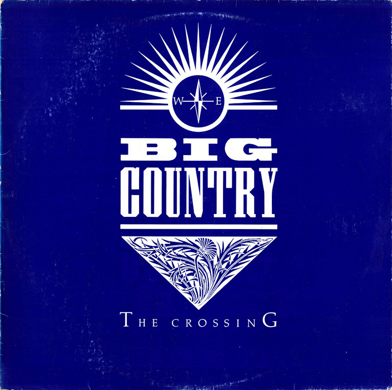 The Crossing (New Zealand), BIGA-1 © 1983 Phonogram Ltd. (London) / Virgin Music (Publishers) Ltd. Released 1983 in blue smooth card sleeve, silver lettering; black/colour paper record label. Includes double-sided lyric sheet. Side One: 1 In A Big Country, 2 Inwards, 3 Chance, 4 1000 Stars, 5 The Storm. Side Two: 1 Harvest Home, 2 Lost Patrol, 3 Close Action, 4 Fields Of Fire, 5 Porrohman. Bruce Watson: Guitars, E-Bow, Vocals; Stuart Adamson: Vocals, Guitars, E-Bow, Piano; Tony Butler: Bass Guitars, Vocals; Mark Brzezicki: Drums, Percussion, Vocals; Additional Vocals by Christine Beveridge. Produced by Steve Lillywhite, Engineered by Will Gosling, assisted by Steve Chase & Mike Nocito. Recorded at The Manor and RAK Studios, May 1983. Photo by Paul Cox. Sleeve by J.B. & Q.Branch (Julian Balme). Management: Ian Grant for Grant-Edwards Management. All tracks © Big Country/Virgin Music Ltd. Song lyrics on inner sleeve listed in album order. Marketed in Australasia by Polygram Records under Exclusive licence. Runout text: (1) "700 BIGA 001 - A ..." (etched), (2) "700 BIGA 001 - B ..." (etched). N.B. Side 1 label has a mid-dot instead of a colon in the duration of "In A Big Country" (see detail image).