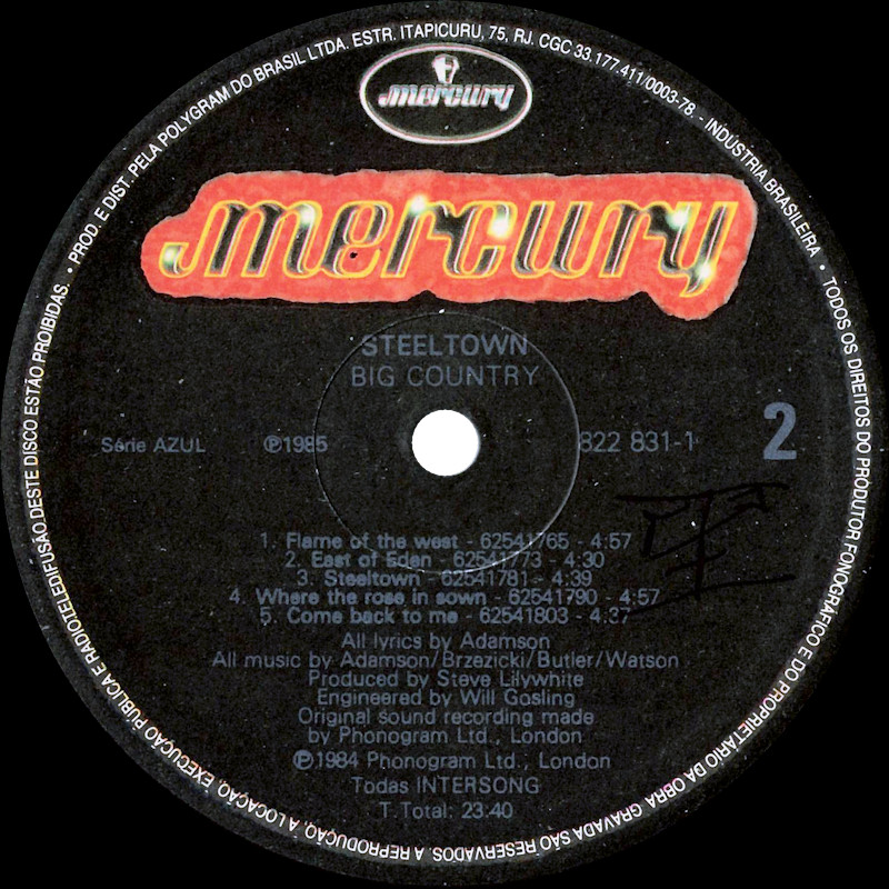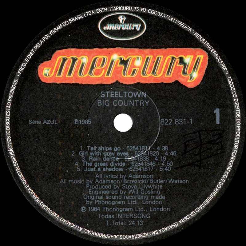 Steeltown (Brazil), 822 831-1 © 1984 Phonogram Ltd. (London) / Mercury / Intersong Released in right-opening card narrow box sleeve with black edge print, double-sided black matt paper lyric sheet, colour paper labels. Side 1: 1 Tall Ships Go (4:38), 2 Girl With Grey Eyes (4:46), 3 Rain Dance (4:19), 4 The Great Divide (4:50), 5 Just A Shadow (5:40). Total time: 24:13. Side 2: 1 Flame Of The West (4:57), 2 East Of Eden (4:28), 3 Steeltown (4:36), 4 Where The Rose Is Sown (4:58), 5 Come Back To Me (4:36). Total time: 23:40. ℗ 1985 Série AZUL. ℗ 1984 Phonogram Ltd., London. Stuart Adamson: Vocals, Guitars, E-Bow; Mark Brzezicki: Drums & Percussion; Tony Butler: Vocals & Bass; Bruce Watson: Guitar, E-Bow & Mandolin; Producer: Steve Lillywhite, Engineer: Will Gosling. Recorded at: Polar Studios, Stockholm and RAK Studios, London. Mixed at: RAK Studios, London and Roundhouse Studios, London. All words by Stuart Adamson, All Music by Adamson, Brzezicki, Butler, Watson. Lyrics reproduced by kind permission of 10 Music Ltd. Sleeve Design: J.B. (Julian Balme), Photography: Brian Aris. Management: Grant·Edwards. CGC no 29.101.519/0001-32 sob licenca da Polygram do Brasil Ltda. Record Company: Polygram do Brasil Ltda. Published by Intersong. Made in Brazil. Fabricado e distribuido por Fonobrás, Distribuidora Fonográfica Brasileira Ltda. Printed by Van Moorsel, Andrade & Cia. Ltda. Spine text: "MERH49 MERCURY · STEELTOWN · BIG COUNTRY". Runout text: (1) "822 831-1 1 01", (2) "822 831-1 2 01" (both etched). Também em Musicassette 822831-4. Sleeve is a low-quality copy of the original, over-printed with additional text on the rear. N.B. Side 1 and 2 tracks are reversed compared to all other versions. |