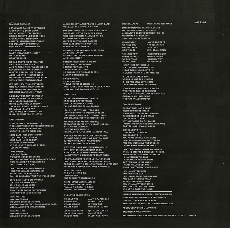 Steeltown (US Promo), 422-822 831-1 M-1 © 1984 Phonogram Ltd. (London) / Mercury / Virgin Music (Publishers) Ltd. Released: 1984 in smooth card box sleeve with spine print, double-sides grey paper eliptical-lipped inner lyric sleeve, black/colour printed label. Front colour hype sticker, rear gold embossed promo stamp. Side One: 1 Flame Of The West (4:57), 2 East Of Eden (4:20), 3 Steeltown (4:35), 4 Where The Rose Is Sown (4:55), 5 Come Back To Me (4:43). Side Two: 1 Tall Ships Go (4:35), 2 Girl With Grey Eyes (4:47), 3 Rain Dance (4:19), 4 The Great Divide (4:50), 5 Just A Shadow (5:35). © & ℗ 1984 Phonogram Ltd. Stuart Adamson: Vocals, Guitars, E-Bow; Mark Brzezicki: Drums & Percussion; Tony Butler: Vocals & Bass; Bruce Watson: Guitar, E-Bow & Mandolin; Producer: Steve Lillywhite, Engineer: Will Gosling. Recorded at: Polar Studios, Stockholm and RAK Studios, London. Mixed at: RAK Studios, London and Roundhouse Studios, London. All words by Stuart Adamson, All Music by Adamson, Brzezicki, Butler, Watson. Lyrics reproduced by kind permission of 10 Music Ltd. Sleeve Design: J.B. (Julian Balme), Photography: Brian Aris. Management: Grant·Edwards. Rights Society: ASCAP & BMI. Manufactured and Marketed by PolyGram Records Inc. Pressing Plant: 22. Pressed by Allied Record Company. Printed in U.S.A. Runout text: (A) "1-1 Δ SLM 8144 + (circled) B-20192-ALD1 422-822-831-1-AS-ALD1" (etched) "STERLING" (stamped), (B) "422 822-831-1-BS-ALD O B-20193 Δ SLM 8144-X 1-2" (etched) "STERLING" (stamped). Promo stamp: "Lent for Promotional Use Only. Any Sale or Unauthorized transfer is Prohibited and Void Subject to Return Upon Demand by Owner. Acceptance of this Record Constitutes Agreement to the Above."