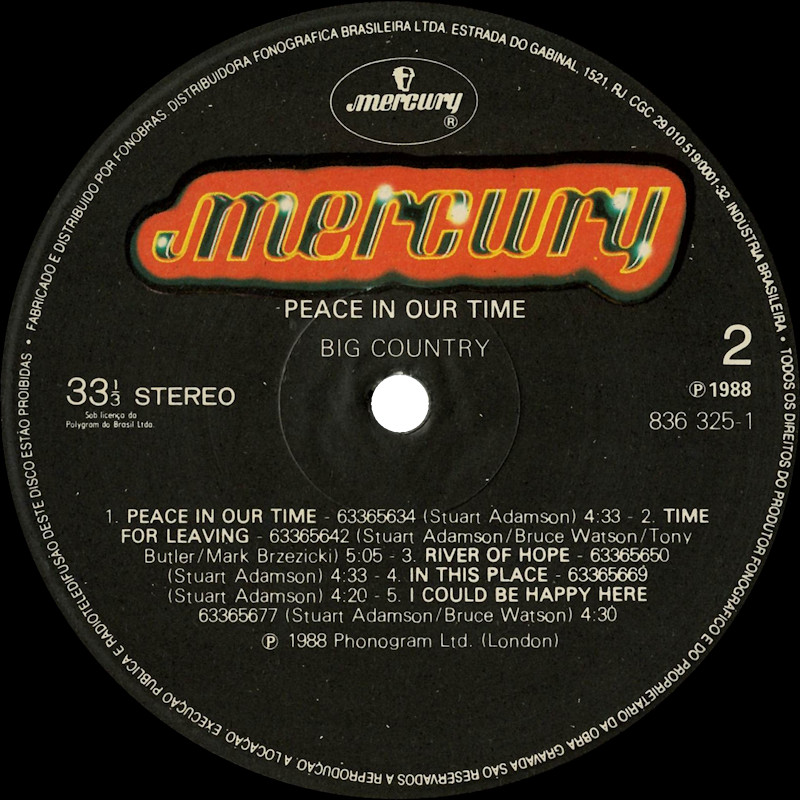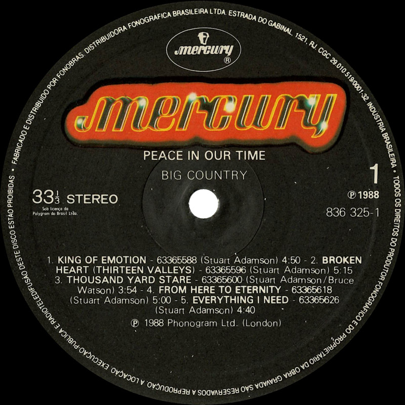 Peace In Our Time (Brazil), 836325-1 © 1988 Phonogram Ltd. (London) / Mercury / 10 Music Ltd. Released 1988 in card narrow box-sleeve with black spine text, double-sided b&w paper lyric sheet, plastic record bag and colour paper record labels. Side 1: 1 King Of Emotion (Stuart Adamson) (4:50), 2 Broken Heart (13 Valleys) (Stuart Adamson) (5:15), 3 Thousand Yard Stare (Stuart Adamson/Bruce Watson) (3:54), 4 From Here To Eternity (Stuart Adamson) (5:00), 5 Everything I Need (Stuart Adamson) (4:40). Side 2: 1 Peace In Our Time (Stuart Adamson) (4:33), 2 Time For Leaving (Stuart Adamson/Bruce Watson/Tony Butler/Mark Brzezicki) (5:05), 3 River of Hope (Stuart Adamson) (4:33), 4 In This Place (Stuart Adamson) (4:20), 5 I Could Be Happy Here (Stuart Adamson/Bruce Watson) (4:30). ℗ & © 1988 Phonogram Ltd.(London). Produced by Peter Wolf. Engineered by Brian Malouf & Jeremy Smith. Mixed by Brian Malouf. Pre-Production at Balmule Studios, Dunfermline. Recorded at 41B Studios, Westlake Village. Mixed at Smoketree Studios. All words and Music by Stuart Adamson, except 3 & 10 also by Bruce Watson and 7 also by Bruce Watson, Tony Butler & Mark Brzezicki. Stuart Adamson: Vocals, Guitars & E-Bow. Mark Brzezicki: Drums & Percussion. Tony Butler: Bass Vocals, Guitar. Bruce Watson: Guitars, Mandolin, Sitar, Mouth Organ & E-Bow. Keyboards by Peter Wolf. Additional vocals by Merry Clayton, Ina Wolf, Donna Davidson, Maxi Anderson. Live Keyboards by Josh Phillips Gorse. Made and Distributed by Fonobrás, Distribuidora Fonográfica Brasileira Ltda. CGC no 29.010.519/0001-32 RJ sob licenca da Polygram do Brasil Ltda. Record Company: Polygram do Brasil Ltda. Published by Intersong. Made in Brazil. Fabricado e distribuido por Fonobrás, Distribuidora Fonográfica Brasileira Ltda. Runouts: (1) "836 235-1 1 01 ℗ 1988 200" (etched), (2) "836 235-1 1 01 ℗ 1988 200" (stamped). Também em Musicassette 836325-4 / CD 836326-1. Spine text: "MERCURY BIG COUNTRY - PEACE IN OUR TIME 836325-1". Sleeve cover is a low-quality cropped copy of the original, with a white box obscuring the original barcode etc. over-printed with additional text on the rear. Lyric sheet is a low quality black and white copy of the original colour inner record sleeve. |