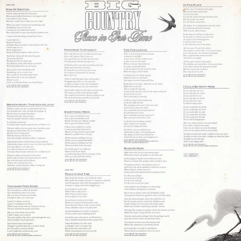 Peace In Our Time (Gatefold), MERH 130 (836325-1) © 1988 Phonogram Ltd. (London) / Mercury / 10 Music Ltd. Released September 1988 in left-opening card gatefold box-sleeve with hype sticker, white glossy paper lyric inner, white paper record labels. Side One: 1 King Of Emotion, 2 Broken Heart (13 Valleys), 3 Thousand Yard Stare, 4 From Here To Eternity, 5 Everything I Need. Side Two: 1 Peace In Our Time, 2 Time For Leaving, 3 River of Hope, 4 In This Place, 5 I Could Be Happy Here. ℗ & © 1988 Phonogram Ltd.(London). Produced by Peter Wolf. Engineered by Brian Malouf & Jeremy Smith. Mixed by Brian Malouf. Pre-Production at Balmule Studios, Dunfermline. Recorded at 41B Studios, Westlake Village. Mixed at Smoketree Studios. All words and Music by Stuart Adamson, except 3 & 10 also by Bruce Watson and 7 also by Bruce Watson, Tony Butler & Mark Brzezicki. Stuart Adamson: Vocals, Guitars & E-Bow. Mark Brzezicki: Drums & Percussion. Tony Butler: Bass Vocals, Guitar. Bruce Watson: Guitars, Mandolin, Sitar, Mouth Organ & E-Bow. Keyboards by Peter Wolf. Additional vocals by Merry Clayton, Ina Wolf, Donna Davidson, Maxi Anderson. Live Keyboards by Josh Phillips Gorse. Label Code: LC0268. Price Code: PG281.Made in England. Also available on: CD: 836 325-2 & MC: MERHC 130 (U.K.) / 836 325-4 (Int.).