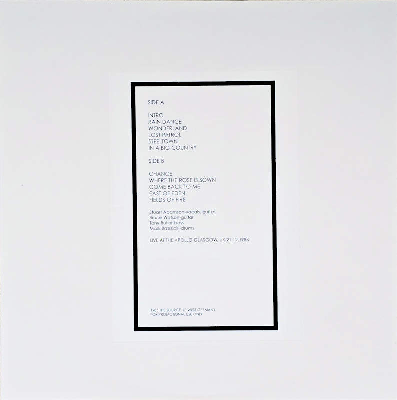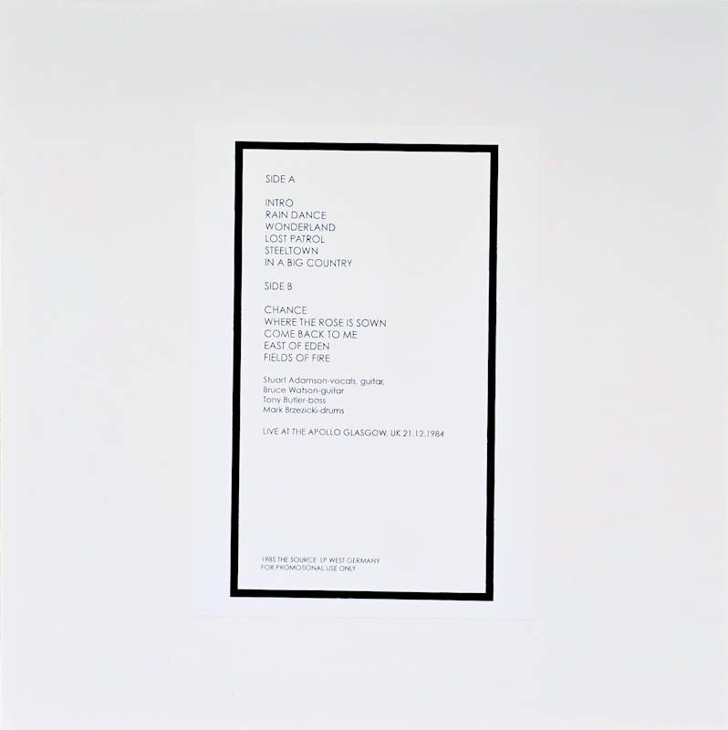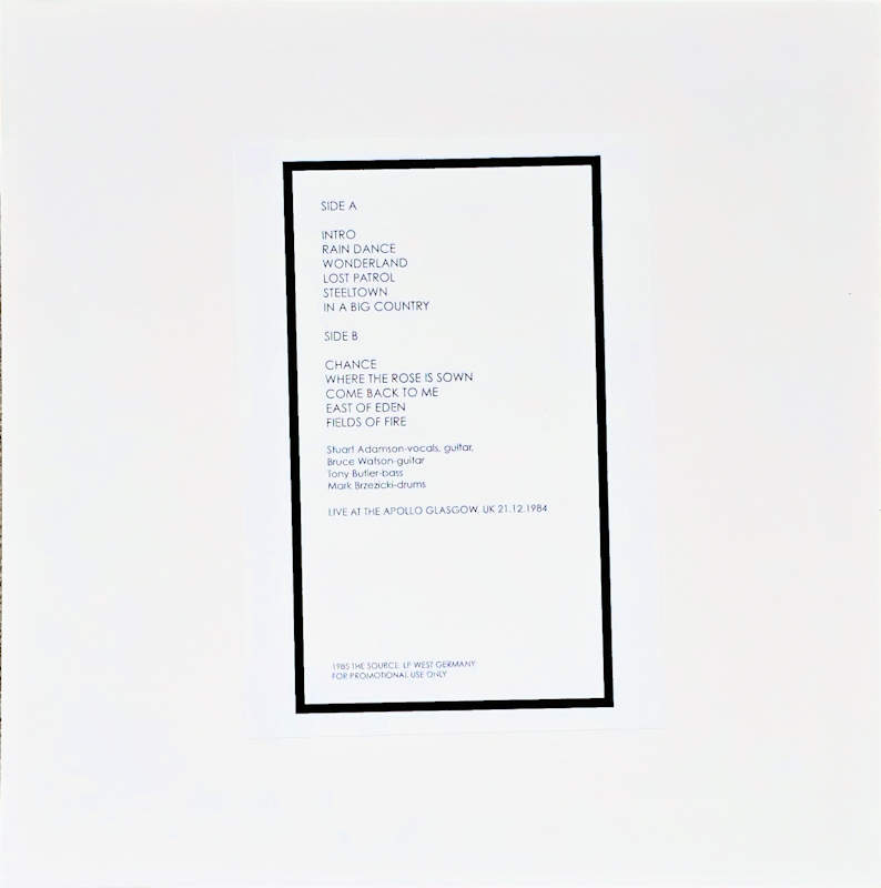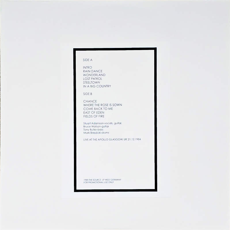Glasgow, (No Cat No) The Source Released 1985 in 4 white card sleeves with front & rear stickers, white centre-hole paper inners, 4x colour translucent vinyl with white paper record labels. All records contain identical tracks: Side A: 1 Intro, 2 Rain Dance, 3 Wonderland, 4 Lost Patrol, 5 Steeltown, 6 In A Big Country. Side B: 1 Chance, 2 Where The Rose Is Sown, 3 Come Back To Me, 4 East Of Eden, 5 Fields Of Fire. 1985 The Source, West Germany. For Promotional Use Only. Stuart Adamson - Vocals, Guitar. Bruce Watson - Guitar. Tony Butler - Bass. Mark Brzezicki - Drums. Unofficial Release - Recorded live at the Apollo Glasgow on 21.12.1984. Runouts: Red, Yellow, Green, Blue: (A) "BCGLASCOW-A"; (B) "BCGLASCOW-B" (all etched).