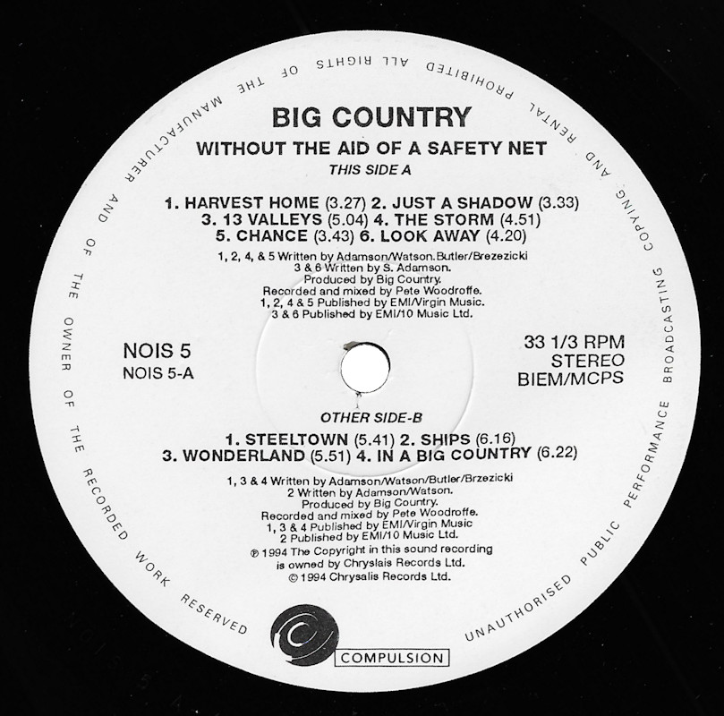 Without The Aid Of A Safety Net (Live), NOIS 5 / 7243 8 29848 1 8, (signed by Tony & Bruce) © 1994 Chrysalis Records Ltd. / Compulsion / EMI/10 Music Ltd. Released 6th June 1994 in glossy card box-sleeve with windowed paper inner, black/white paper record labels. Side One: 1 Harvest Home (3:27), 2 Just A Shadow (3:33), 3 13 Valleys (5:04), 4 The Storm (4:51), 5 Chance (3:43), 6 Look Away (4:20). Side Two: 1 Steeltown (5:41), 2 Ships (6:16), 3 Wonderland (5:51), 4 In A Big Country (6:22). ℗ & © 1994 Chrysalis Records Ltd. Produced by Big Country. Recorded on 29th December 1993 at Glasgow Barrowlands. Recorded and Mixed by Pete Woodroffe. Mobile Engineer: Will Shapland. Assistant Mix Engineer: Andy Kowalski. Managemant: Ian Grant. Manufactured and Distributed by EMI. Rights Society: BIEM/MCPS. Printed in UK. Runout text: (1) "NOIS 5 A-1-1- 1- D" (stamped) "TOWN HOUSE DMM" (etched), (2) NOIS 5 B-1-1-1- D" (stamped) "TOWN HOUSE DMM" (etched). Side A label has a typo in the ℗ info - attributed to "Chryslais Records Ltd." |