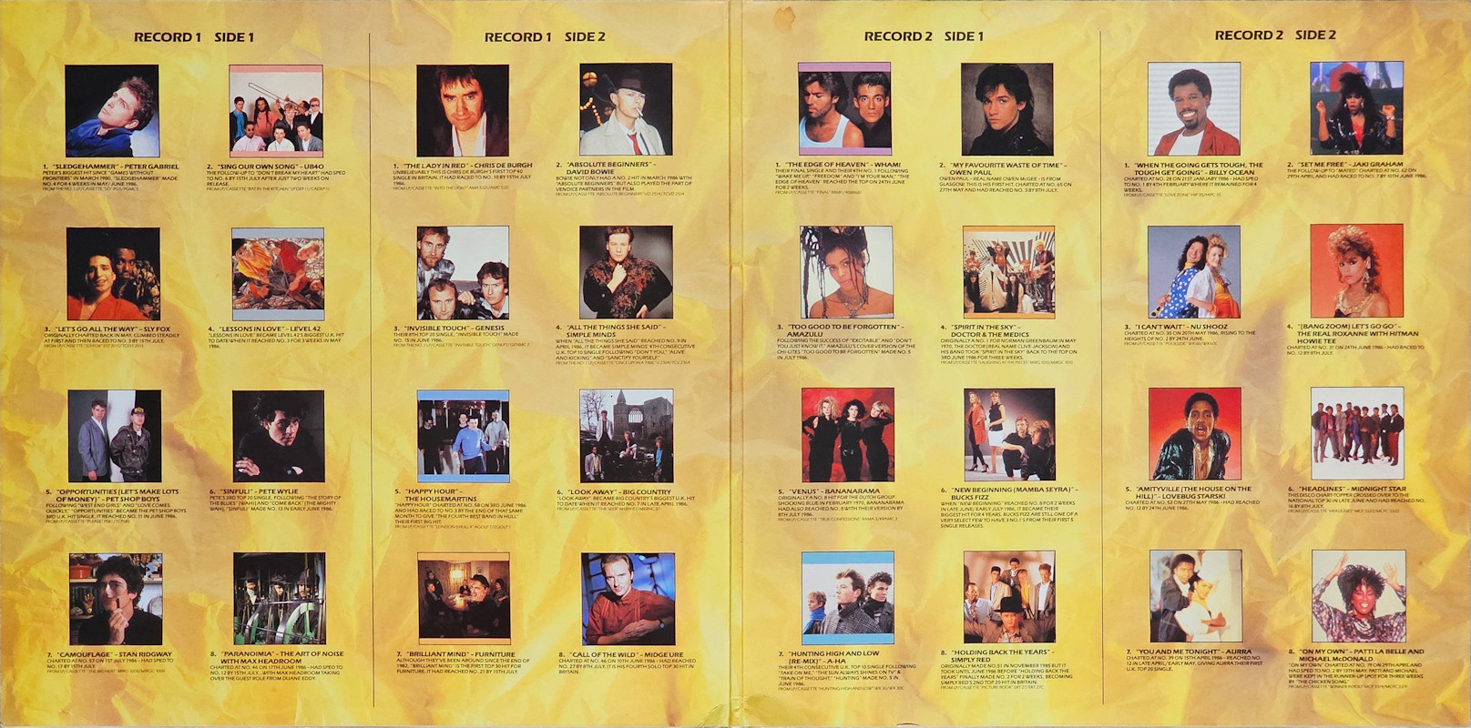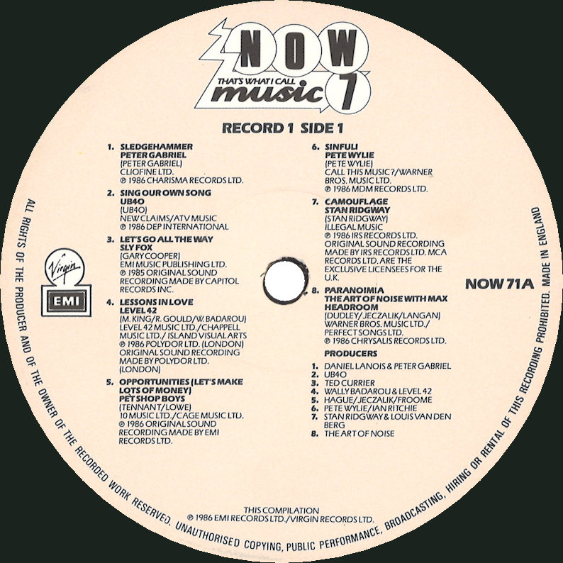 NOW That's What I Call Music 7 (Gatefold Sleeve), NOW 7 © 1986 EMI Records Ltd. / Virgin Records Ltd. / Polygram. Released 1986 in gloss card gatefold box sleeve with spine print and over-sticker, paper record inners, colour paper labels. Record One Side One: 1 Peter Gabriel Sledgehammer (4:53), 2 UB40 Sing Our Own Song (3:58), 3 Sly Fox Let's Go All The Way (3:56), 4 Level 42 Lessons In Love (3:59), 5 Pet Shop Boys Opportunities (Let's Make Lots Of Money) (3:20), 6 Pete Wylie Sinful! (3:54), 7 Stan Ridgway Camouflage (5:03), 8 The Art Of Noise With Max Headroom Paranoimia (3:15). Record One Side Two: 1 Chris De Burgh The Lady In Red (4:09), 2 David Bowie Absolute Beginners (5:33), 3 Genesis Invisible Touch (3:26), 4 Simple Minds All The Things She Said (4:15), 5 The Housemartins Happy Hour (2:19), 6 Big Country Look Away (4:23), 7 Furniture Brilliant Mind (3:39), 8 Midge Ure Call Of The Wild (4:17). Record Two Side One: 1 Wham! The Edge Of Heaven (4:28), 2 Owen Paul My Favorite Waste Of Time (3:25), 3 Amazulu Too Good To Be Forgotten (3:00), 4 Doctor & The Medics Spirit In The Sky (3:27), 5 Bananarama Venus (3:36), 6 Bucks Fizz New Beginning (Mamba Seyra) (4:05), 7 A-ha Hunting High And Low (Re-mix) (3:45), 8 Simply Red Holding Back The Years (4:10), 9 Queen A Kind Of Magic (4:24). Record Two Side Two: 1 Billy Ocean When The Going Gets Tough, The Tough Get Going (4:07), 2 Jaki Graham Set Me Free (3:36), 3 Nu Shooz I Can't Wait (3:37), 4 The Real Roxanne With Hitman Howie Tee (Bang Zoom) Let's Go Go (4:02), 5 Lovebug Starski Amityville (The House On The Hill) (4:09), 6 Midnight Star Headlines (3:21), 7 Aurra You And Me Tonight (3:56), 8 Patti LaBelle & Michael McDonald On My Own (4:33). This compilation ℗ & © 1986 EMI Records Ltd./Virgin Records Ltd. Cover Design: Janet Newman. Designed at McCormicks. Cover Artwork & Typography: The Design Clinic. Photography by Andrew Moran. Now Coordinator: Ashley Abram. Mastered by Nick Webb (Side D). Spine text: "NOW7 NOW MUSIC 7 EMI/VIRGIN". Runout text: (1) "NOW 71 A-1-1-1-1 D", (2) "NOW 71 B-1-1-3-3 D", (3) "NOW 71 A-3-1-2-X1 D", (4) "NOW 72 A-1-1-1-1 D" (all stamped) "NICKZ" (etched). Over-sticker track (Disc C9) not listed on sleeve or labels. Also available on 2x Cassette TCNOW7 and CD (CDNOW8) (2020). |