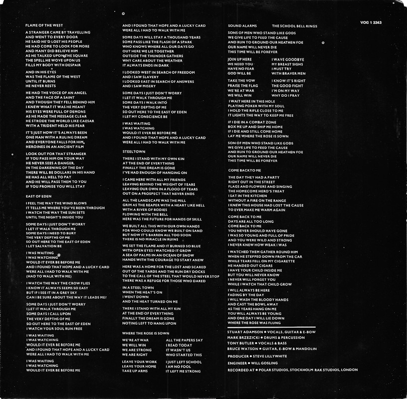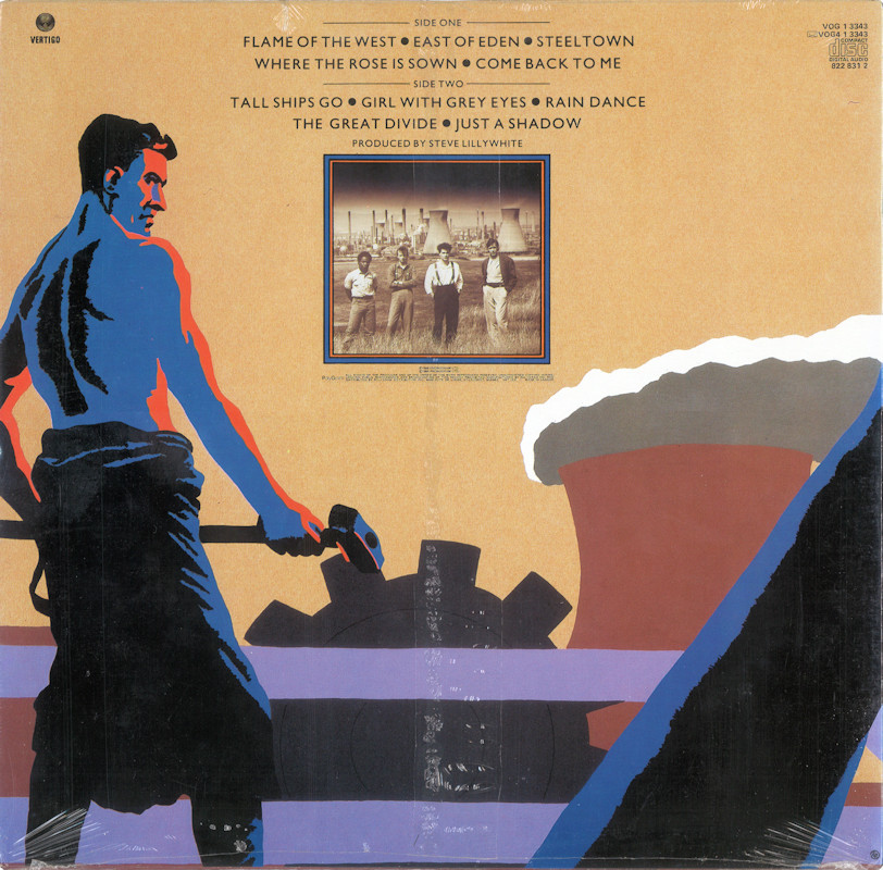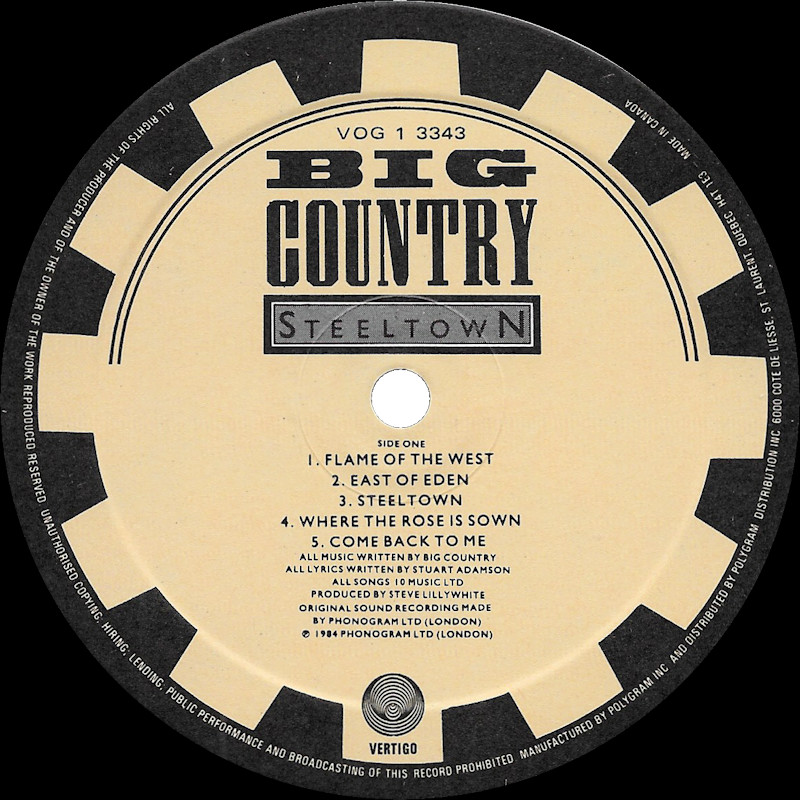 Steeltown (Canada), VOG 1 3343 (in original shrinkwrap) © 1984 Phonogram Ltd. (London) / Vertigo / 10 Music Ltd. Released 1984 in right-opening glossy card box sleeve with black edge print, double-sided top-opening black matt paper lipped lyric sheet, colour paper labels. Side One: 1 Flame Of The West (4:57), 2 East Of Eden (4:28), 3 Steeltown (4:36), 4 Where The Rose Is Sown (4:58), 5 Come Back To Me (4:36). Side Two: 1 Tall Ships Go (4:37), 2 Girl With Grey Eyes (4:45), 3 Rain Dance (4:18), 4 The Great Divide (4:50), 5 Just A Shadow (5:38). © & ℗ 1984 Phonogram Ltd. (London) Stuart Adamson: Vocals, Guitars, E-Bow. Mark Brzezicki: Drums & Percussion. Tony Butler: Vocals & Bass. Bruce Watson: Guitar, E-Bow & Mandolin. Producer: Steve Lillywhite, Engineer: Will Gosling. Recorded at: Polar Studios, Stockholm and RAK Studios, London. Mixed at: RAK Studios, London and Roundhouse Studios, London. All words by Stuart Adamson. All Music by Adamson, Brzezicki, Butler, Watson. Lyrics reproduced by kind permission of 10 Music Ltd. Sleeve Design: J.B. (Julian Balme), Photography: Brian Aris. Management: Grant·Edwards. Manufactured by PolyGram Inc. Distributed by PolyGram Distribution Inc., Quebec. Made in Canada. Printed by Ever Reddy. Pressed by Cinram. Lacquer cut at Disques SNB Ltée. Lacquer but by Émile Lépine. Spine text: "STEELTOWN BIG COUNTRY VERTIGO VOG 1 3343". Runout text: (1) "VOG-1-3343A SNB 230 EL" (etched), "CR [circled]" (stamped), (2) "VOG-1-3343 |