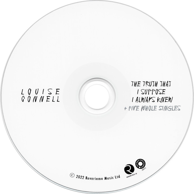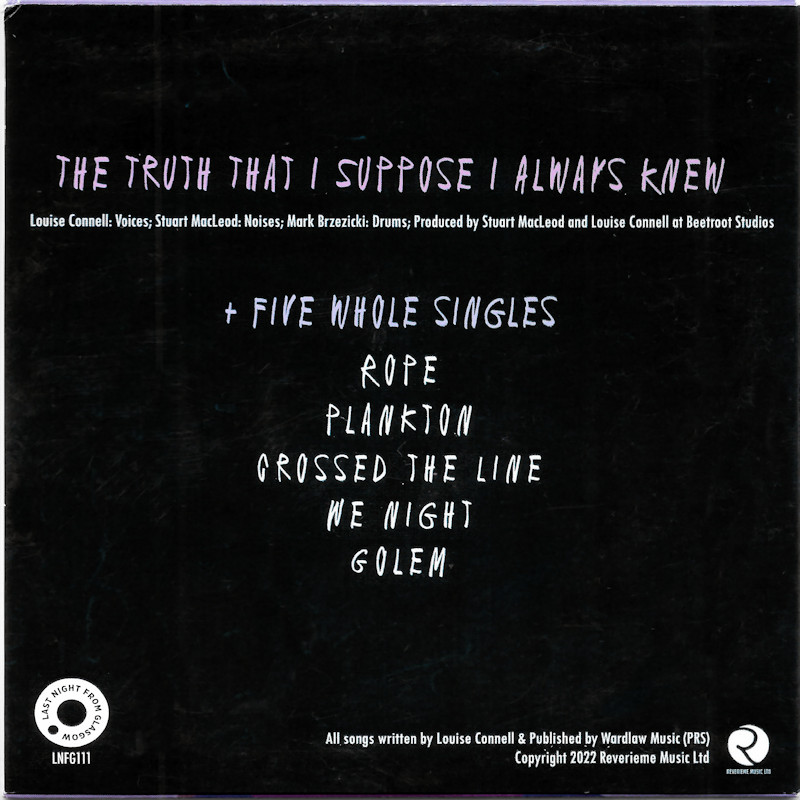 Louise Connell - "The Truth That I Suppose I Always Knew", LNFG111 © Reverieme Music Ltd. / Last Night From Glasgow. Released 2022 in right-opening card pocket, b&w printed CD-R. 1 The Truth That I Suppose I Always Knew (3:01), 2 Rope (3:48), 3 Plankton (4:38), 4 Crossed The Line (3:19), 5 We Might (4:51), 6 Golem (3:39). © 2022 Reverieme Music Ltd. Louise Connell: Vocals. Stuart MacLoed: Noises. Mark Brzezicki: Drums. Produced by Stuart MacLoed & Louise Connell. Produced at Beetroot Studios. All songs written by Louise Connell. Published by Wardlaw Music (PRS). Media: CD-R. CD Matrix: "T80-UG-6 19081405". Mould SID Code: Z1JH A18A V323221214 A52. Track times not listed on CD. |