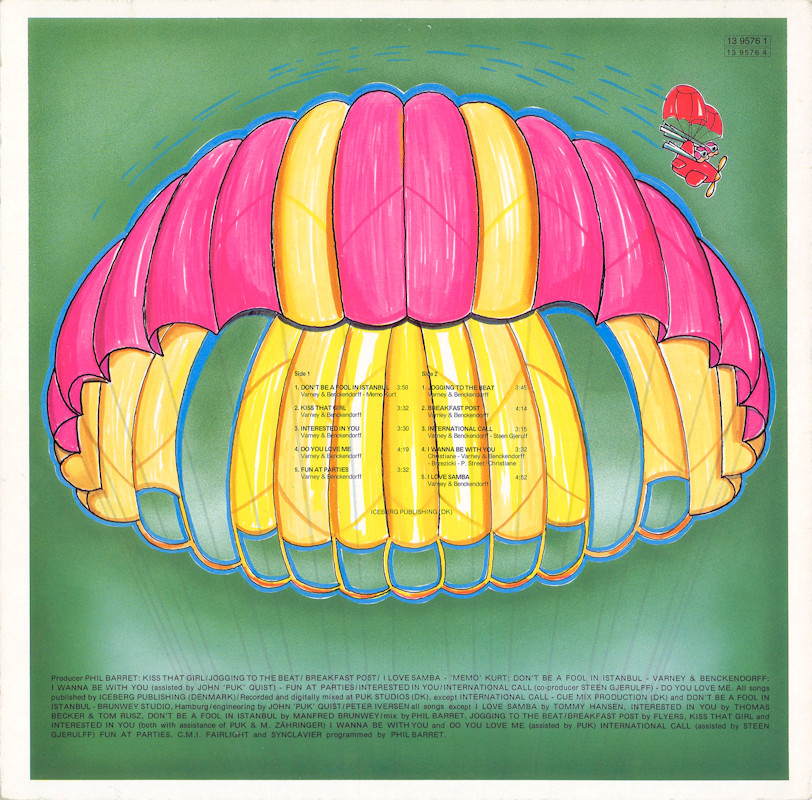 The Flyers - "The Flyers", LP, 13 9576 1 © 1984/5 EMI / Iceberg Publishing (DK). Released 1985 in right-opening card sleeve, colour paper record labels. Side 1: 1 Don't Be A Fool In Istanbul (Varney & Benckendorff, Memo Kurt) (3:58) 2 Kiss That Girl (Varney & Benckendorff) (3:32) 3 Interested In You (Varney & Benckendorff) (3:30) 4 Do You Love Me (Varney & Benckendorff) (4:19) 5 Fun At Parties (Varney & Benckendorff) (3:32) Side 2: 1 Jogging To The Beat (Varney & Benckendorff) (3:45) 2 Breakfast Post (Varney & Benckendorff) (4:14) 3 International Call (Varney & Benckendorff, Steen Gjerulff) (3:15) 4 I Wanna Be With You (Christiane, Varney & Benckendorff, Brzezicki, P. Street, Christiane) (3:32) 5 I Love Samba (Varney & Benckendorff) (4:52) © & ℗ 1984 EMI. A Produced by Memo Kurt, Phil Barret, Varney & Benckendorff. B Produced by Phil Barret, Varney & Benckendorff, S. Gjerulff, John "Puk" Quist. Programmed by Phil Barret: C.M.I., Fairlight and Synclavier. Recorded and digitally mixed at PUK Studios (DK) except International Call at Cue Mix Production (DK) and Don't Be A Fool In Istanbul at Brunwey Studio (Hamburg). Label Code: LC 0542. Rights Society: n©b. Lacquer cut at Bovema / EMI Studios Runouts: (A) "1 39576 1-A//58235-1", (B) "1 39576 1-B//58236-1" (both stamped). |